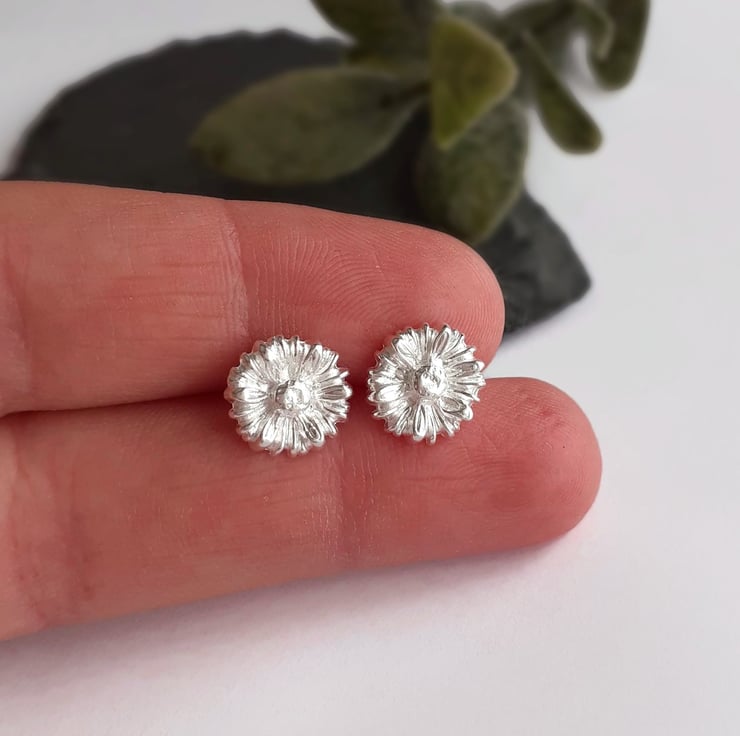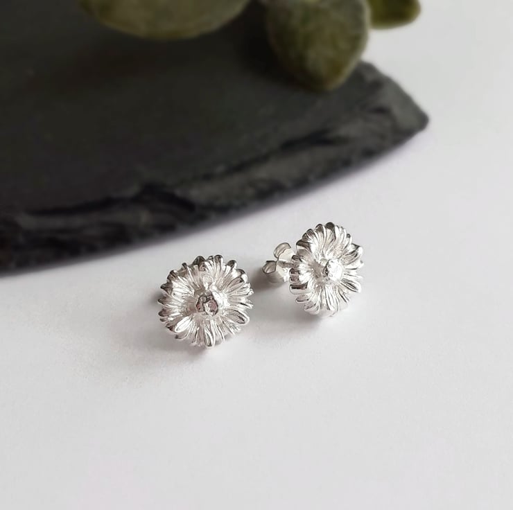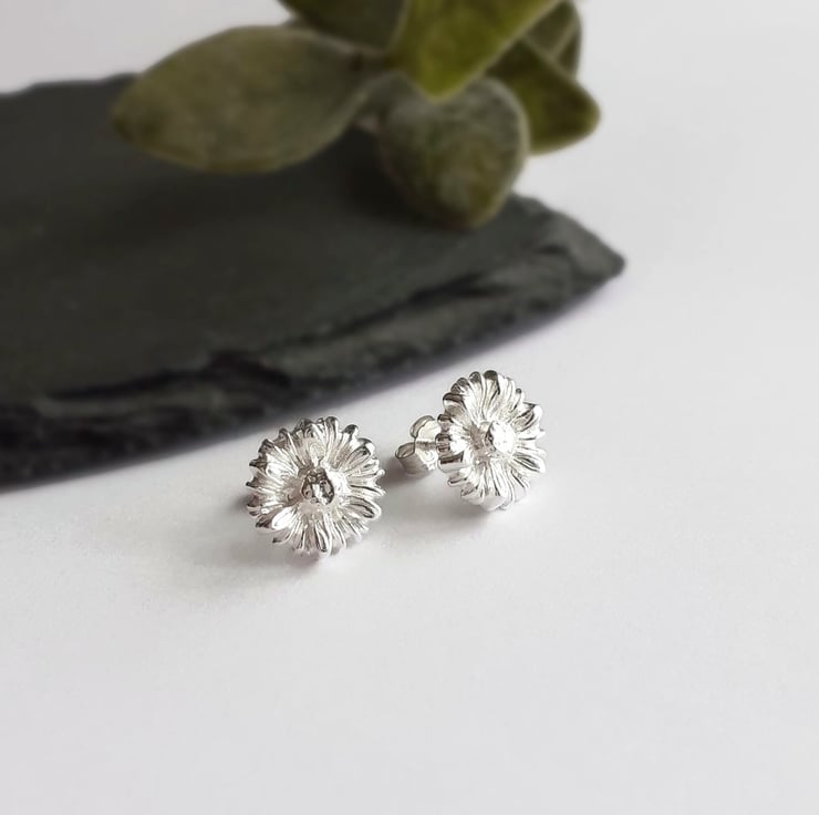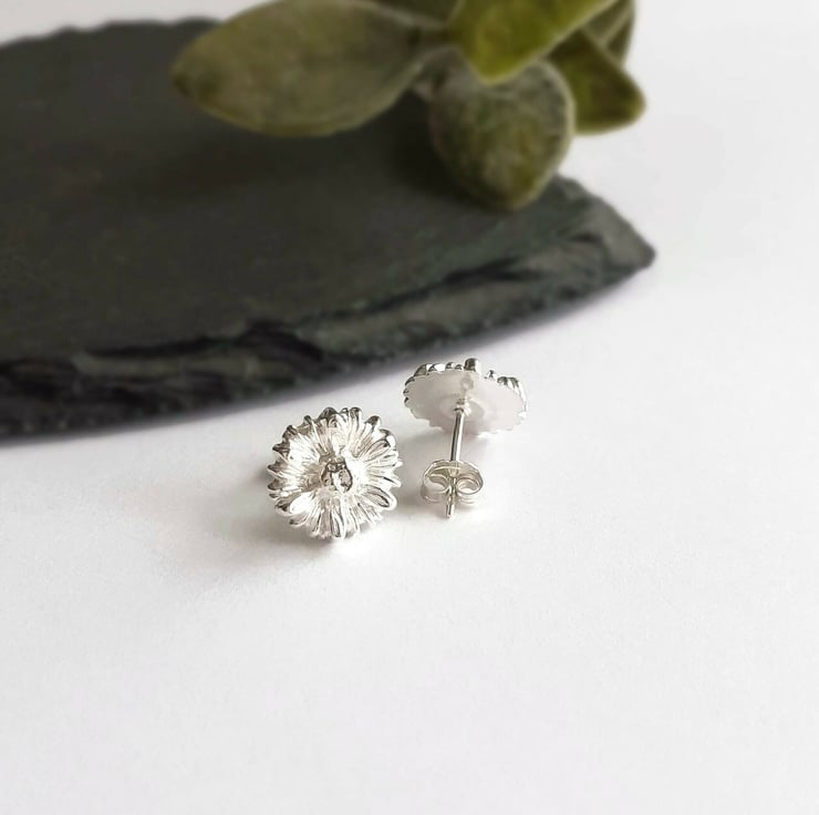 The flower stud earrings are then barrel polished in a tumbler to a high shine. The earrings fasten with sterling silver butterfly backs.
