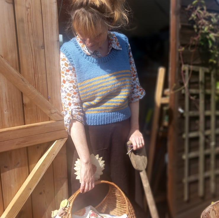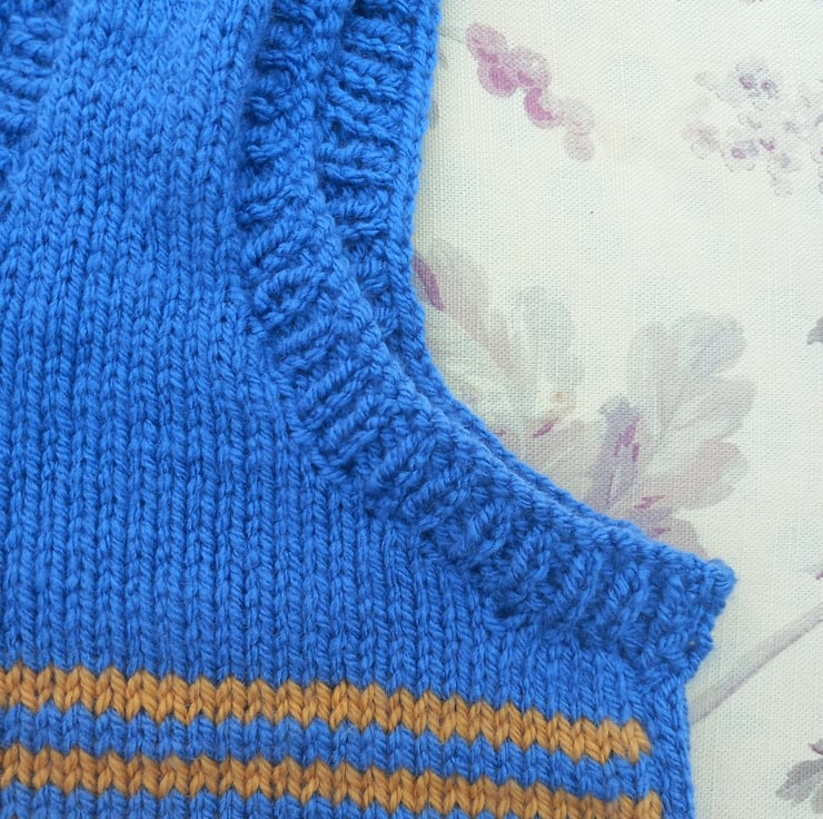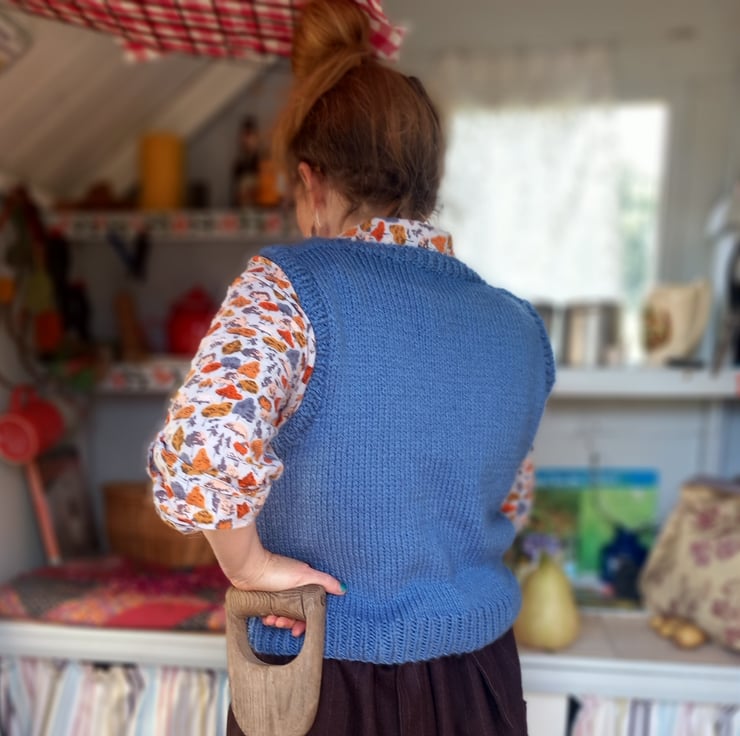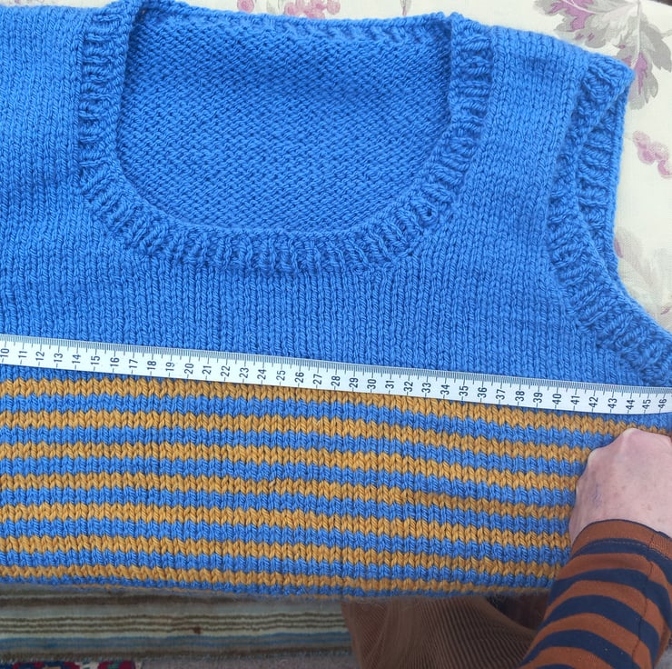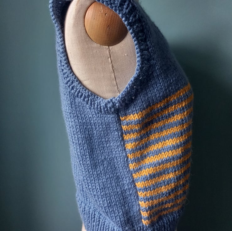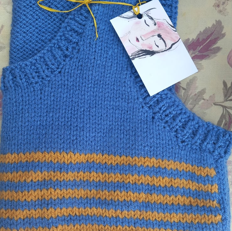 A beautiful powder blue and mustard tank top. Neatly knitted with care. Soft wool with a little acrylic for easy washing and to hold its shape. Come mindfully wrapped. Measuring 49 cm from each arm pit across and body length 48 cm. Width 46cm perfect for a 12 or a close fit 14.