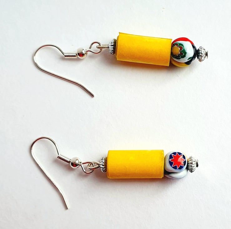 A simple but unique pair of earrings made from a handrolled tubular yellow paper bead and a contrasting multicoloured millefiori venetian glass bead from Murano.