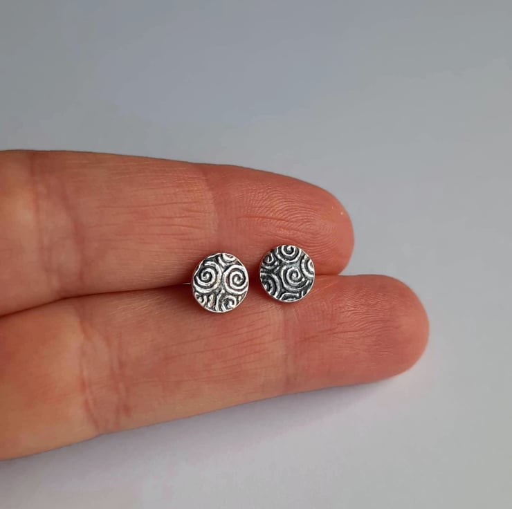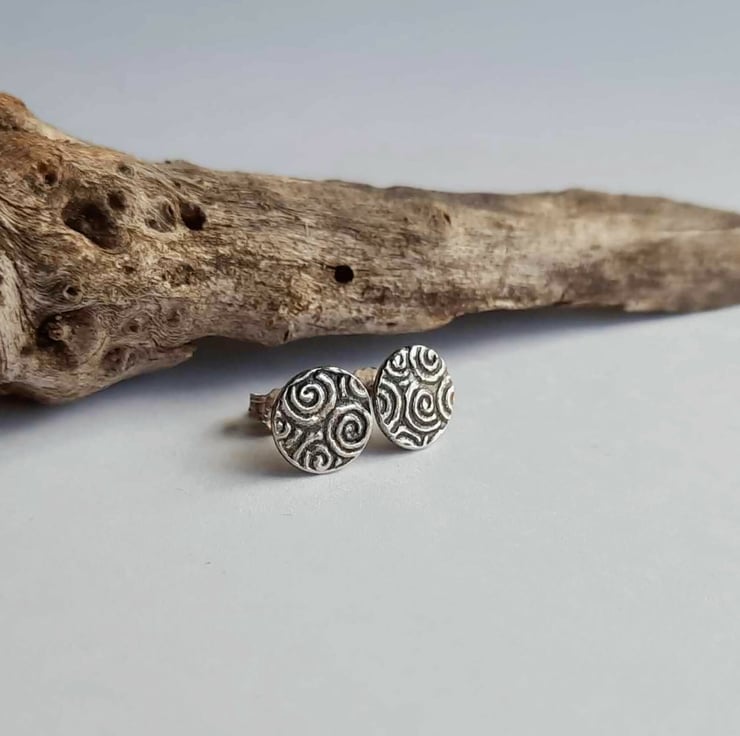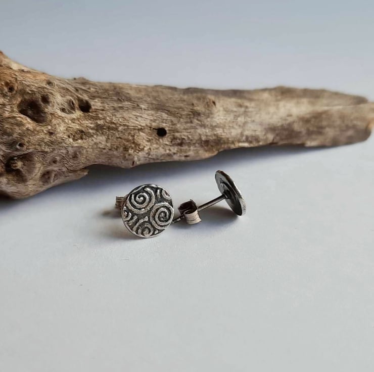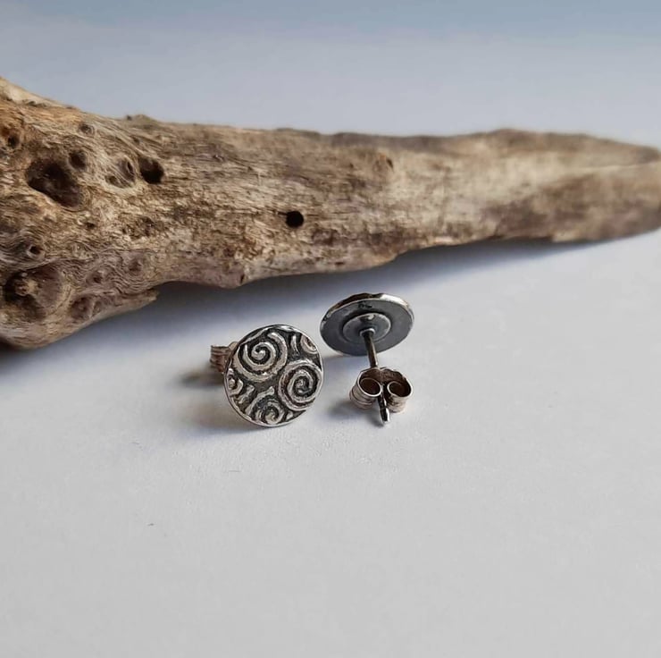 The little spiral patterned studs are then oxidised with a patina to highlight all the lovely details, before being barrel polished in a tumbler. The earrings fasten with sterling silver butterfly backs.