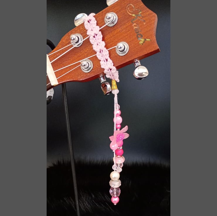 Dingly Danglies are delightful bead and crochet headstock accessories that add a touch of bling and sparkle to your Ukulele.
