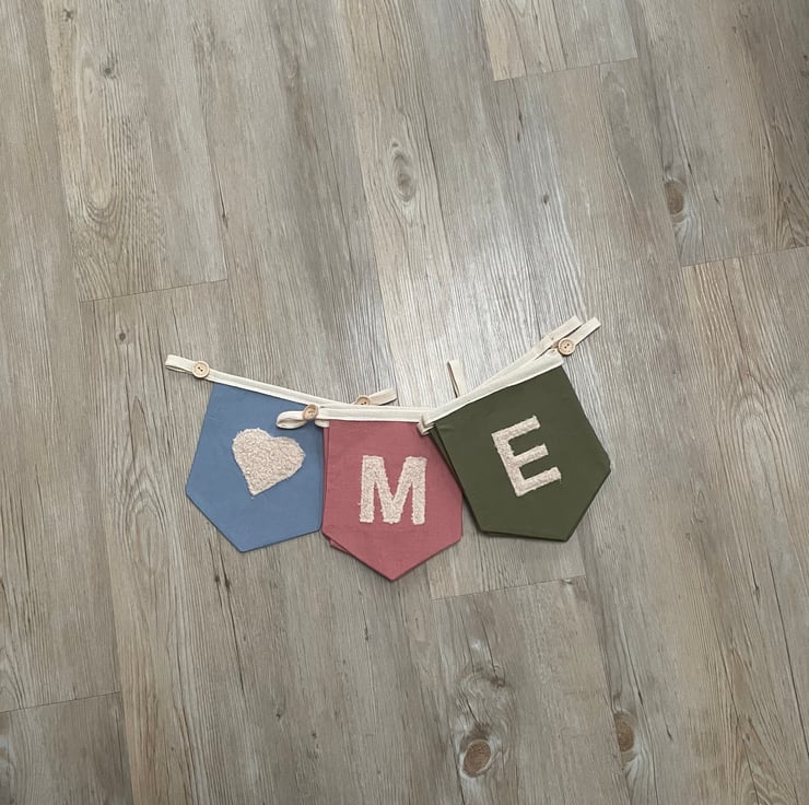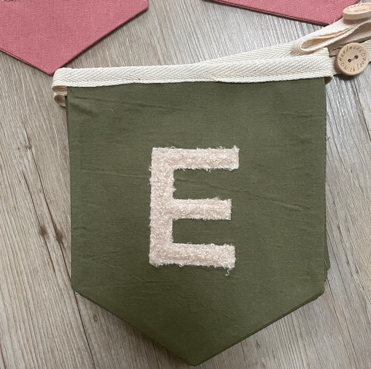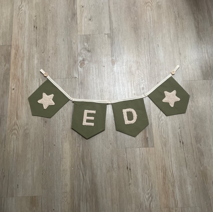 Olive green bunting, personalised with beige teddy fabric name of your choice, these are finished with ends looped for hanging and little decorative wooden buttons each end. Each letter fits on one flag, for short names of four or less letters I recommend adding a heart or star on a flag each end but that is your choice.
