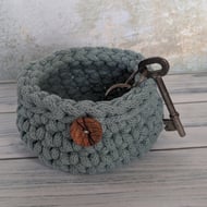 A beautifully tactile crocheted spiral shell in a bright shade of Jade, made from recycled 100% cotton braided cord.The item is fairly sturdy and keeps its shape, yet is soft to the touch.