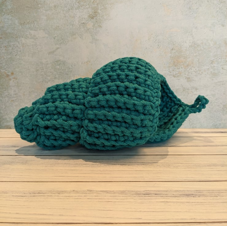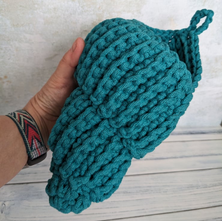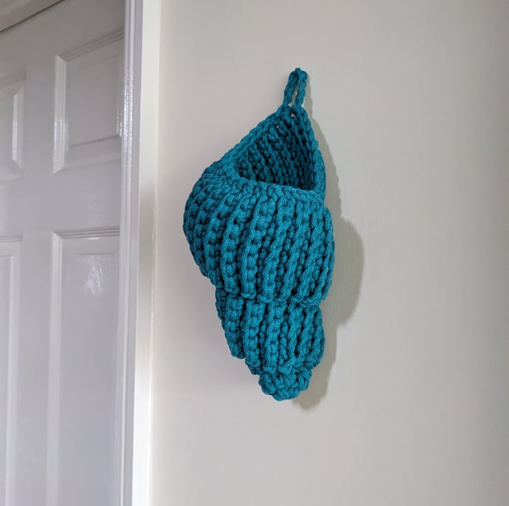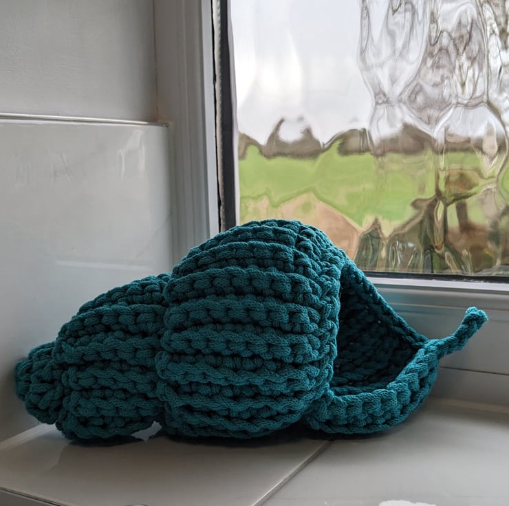 A beautifully tactile crocheted spiral shell in a bright shade of Jade, made from recycled 100% cotton braided cord.The item is fairly sturdy and keeps its shape, yet is soft to the touch.