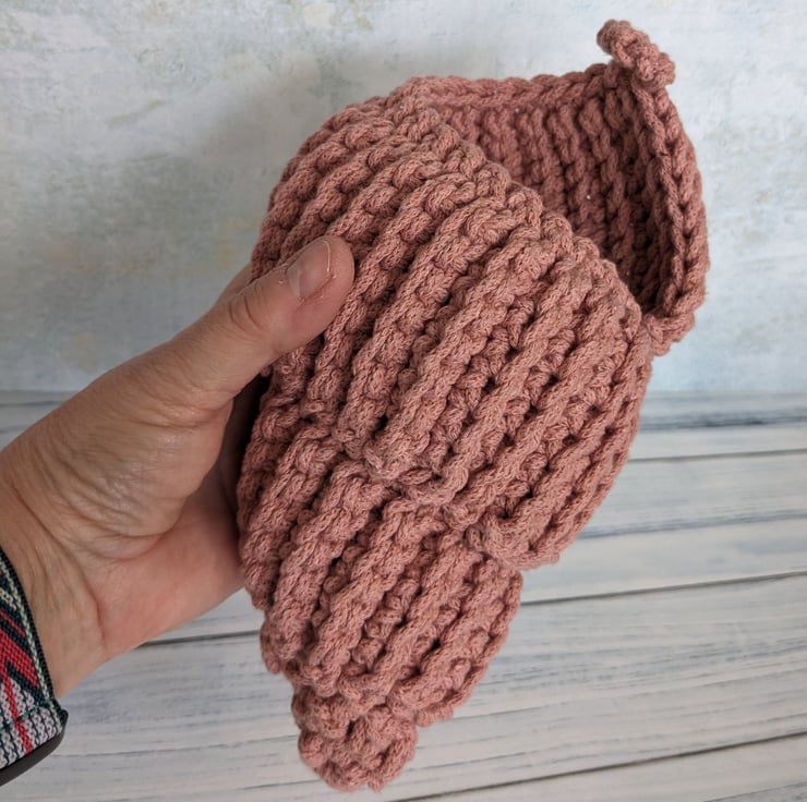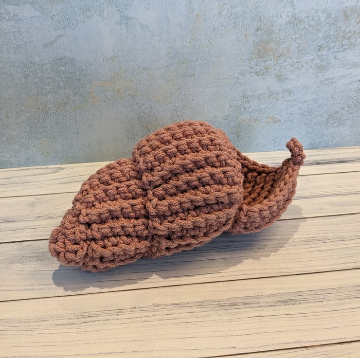 A beautifully tactile crocheted spiral shell in blush pink, made from recycled 100% cotton braided cord.The item is fairly sturdy and keeps its shape, yet is soft to the touch.