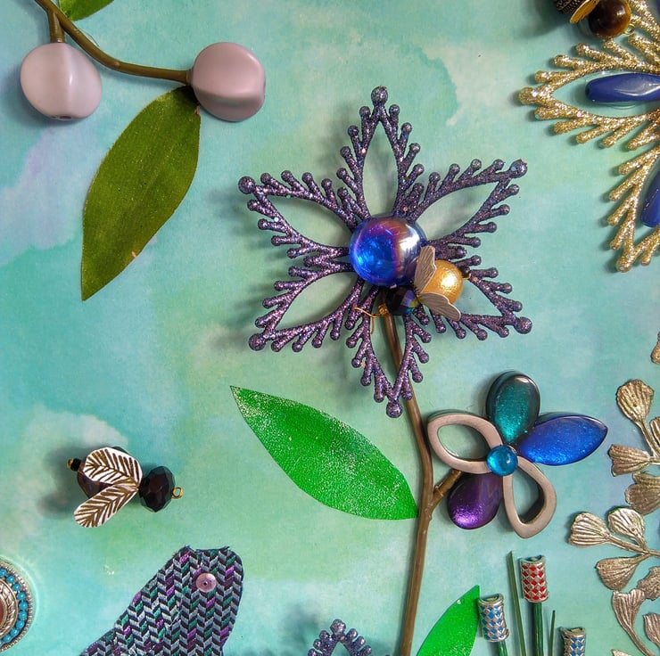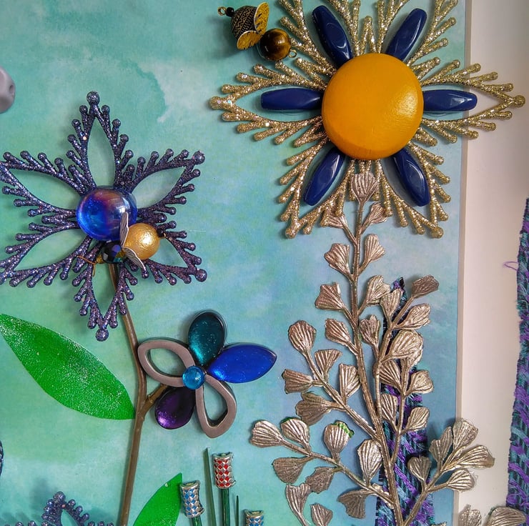 I've used lots of upcycled materials to create this froggy fantasy with beads, sparkly decorations, fabric, faux silk leaves plus others cut from a gel plate print. It's full of colour and vitality.