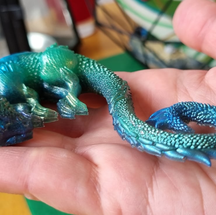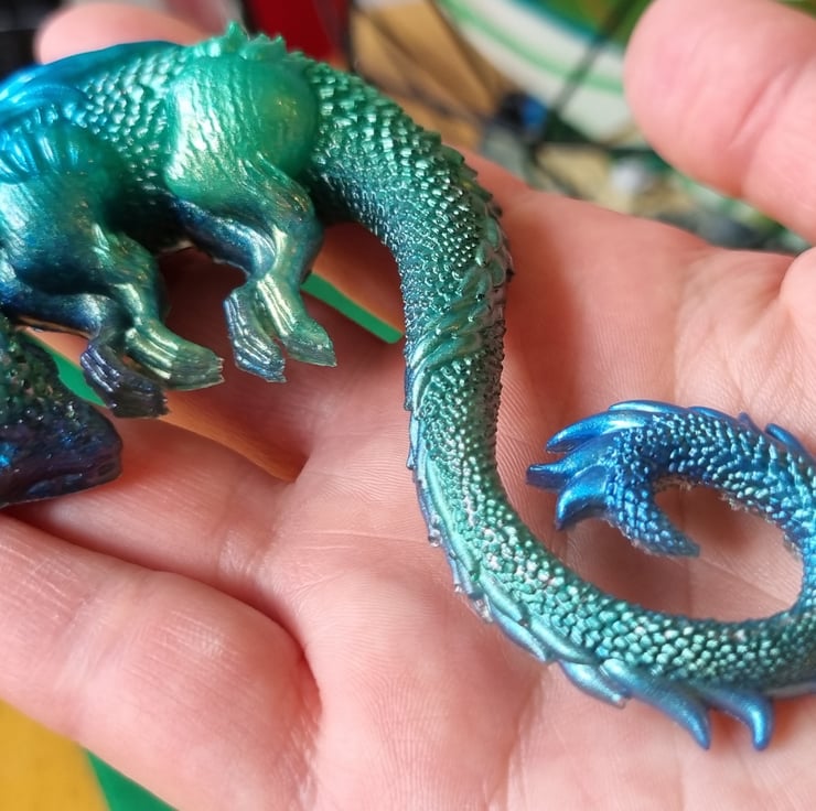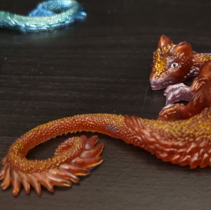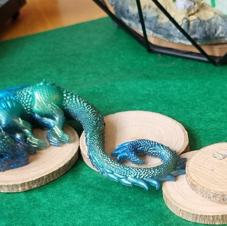 This listing is for a resting dragon called Siren. She is very serpent looking and longer that some of the other dragons we have measuring at 11 cm in length and 6.5 cm in width.