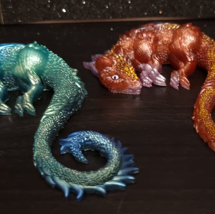 These dragons have been made from professional grade resin and with a variety of colours using mica powder and acrylic paint.
