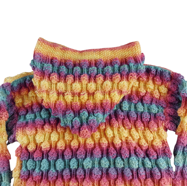 This hand-knitted children's hooded cardigan is perfect for keeping your little one warm and stylish! Made from soft premium acrylic yarn, it features a vibrant rainbow of colors, including pink, purple, green, and blue. The unique bobble texture and self-striping yarn create a fun, abstract design, ensuring every cardigan is one-of-a-kind.