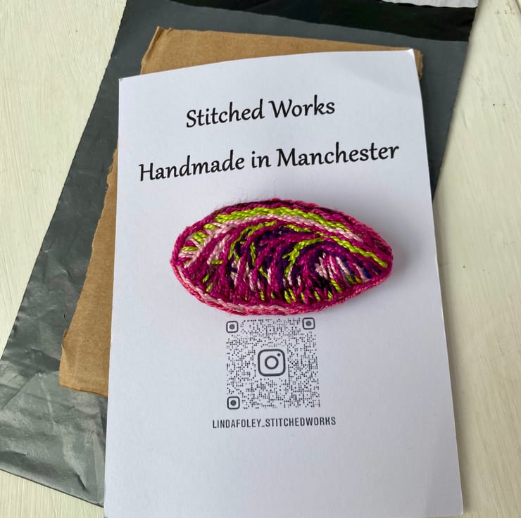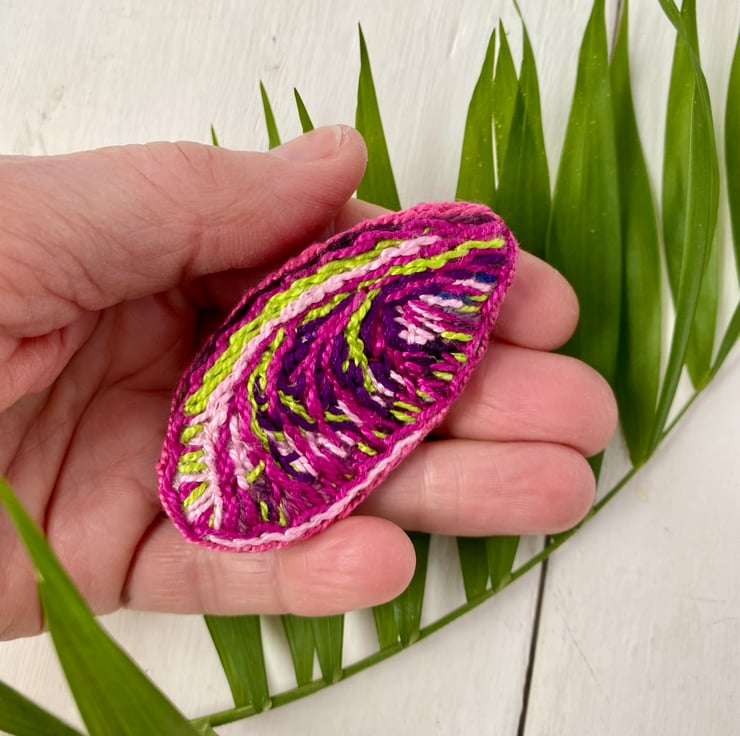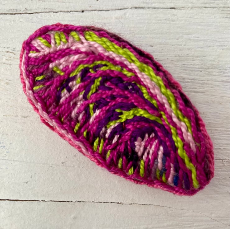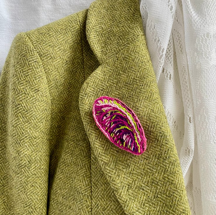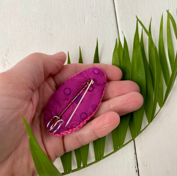 This oval, abstract leaf design brooch, has been completely hand stitched. It has a felt interior and sturdy pin sewn on the back.