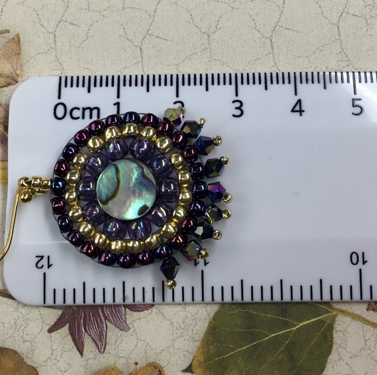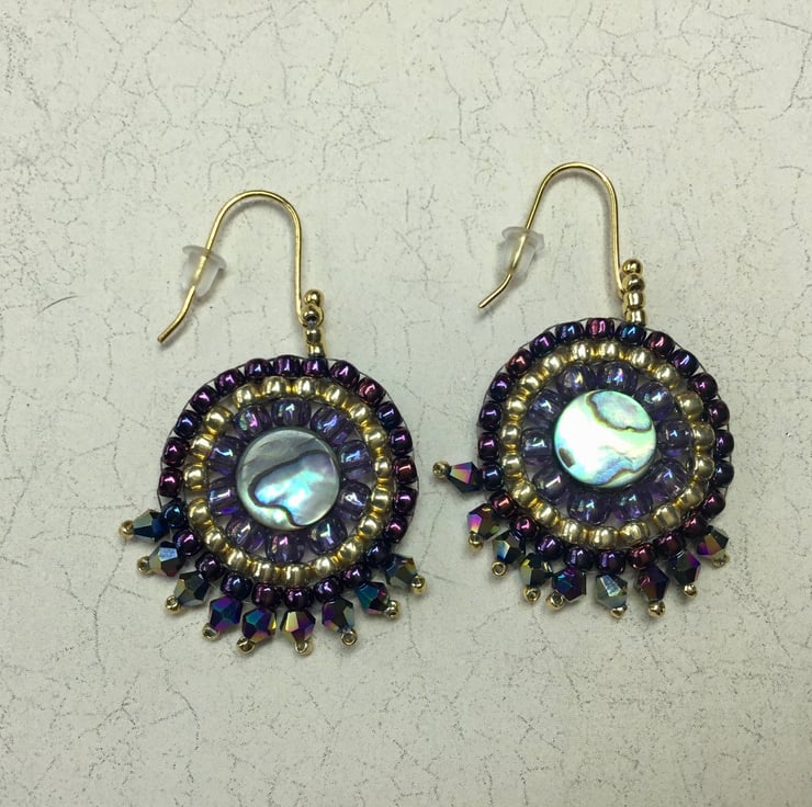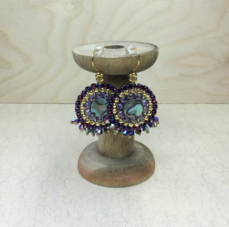 Stunning Abalone Shell and Sparkling seed bead and Crystal Earring beaded in brick stitch. The centre 10mm Abalone Shell flat coin is encased in seed beads in colours of gold and purple, with sparkling purple /gold bicone crystals along the bottom edge.