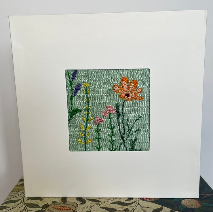 This is one of a series of flower border cards hand stitched by me on a ice green shot silk background.