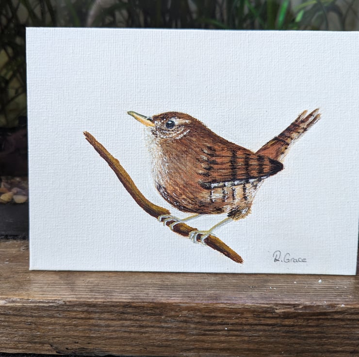 A 7" x 5" acrylic painting of a Wren on a flat, white canvas board, finished with an acrylic varnish.