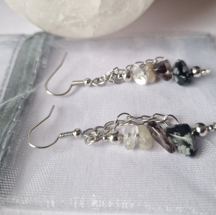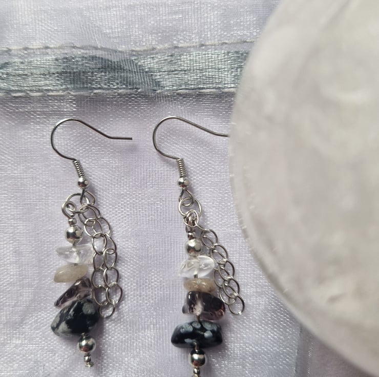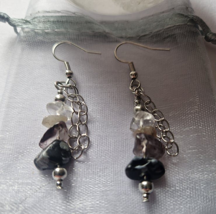 Beautiful handmade sterling silver dangle earrings, made with gemstones/crystals, beads and sterling silver chain. Comes with two different plastic backs in gift bag, sent with love.