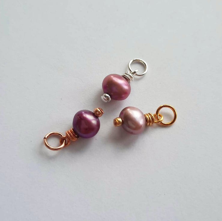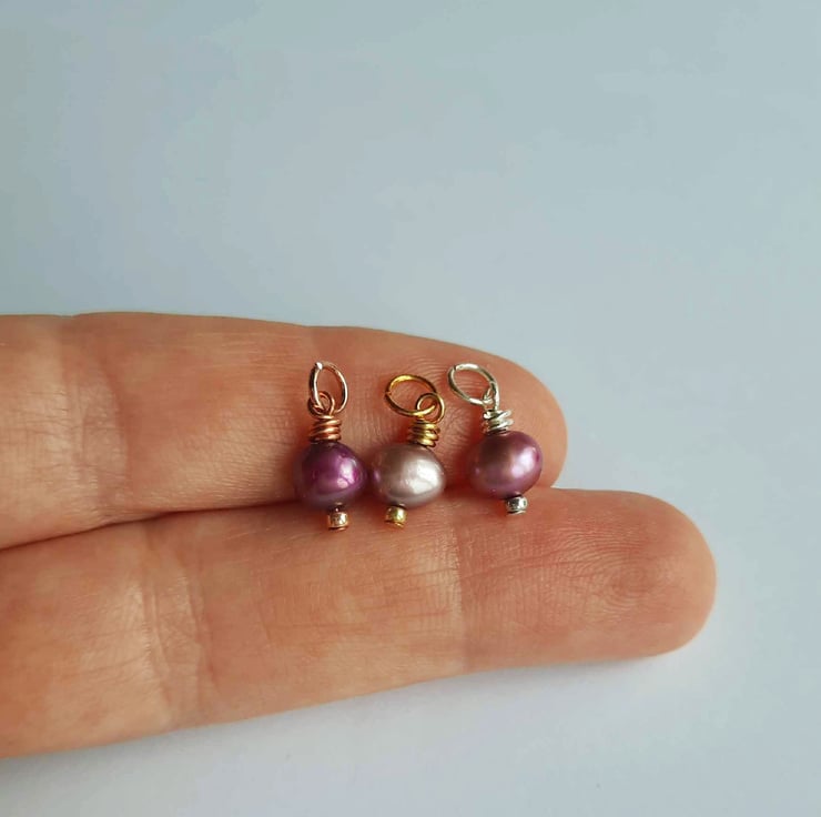 Lustrous purple freshwater pearls are securely wire wrapped by hand to create a delicate dangle charm or pendant ready for you to add to your own jewellery creations.