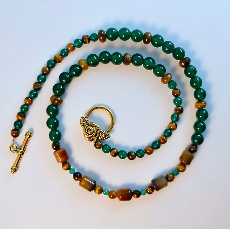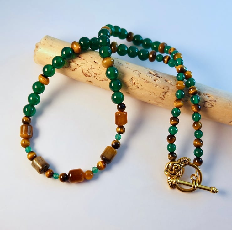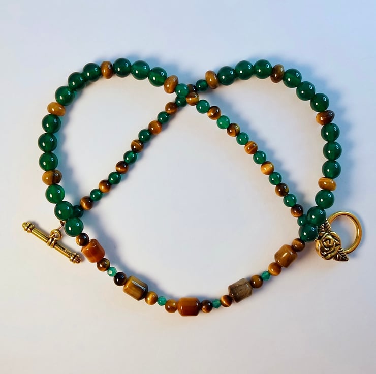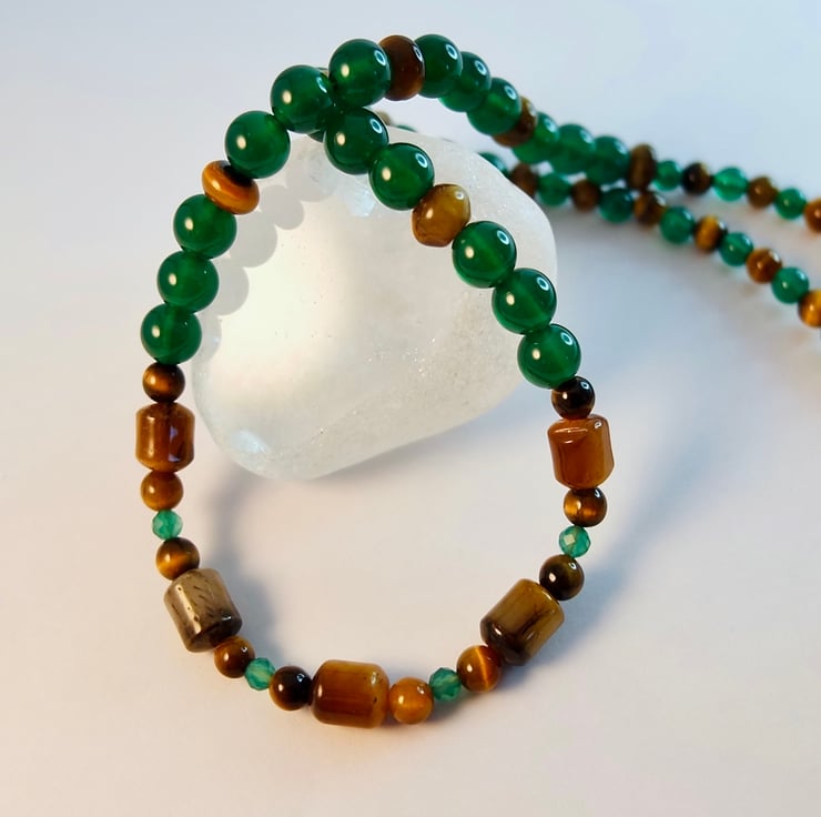 A centrepiece of 4mm round and 6x8mm Tiger's Eye drum beads, separated by 3mm faceted Green Onyx for a subtle glint.