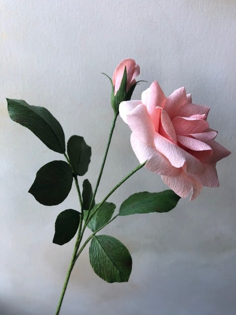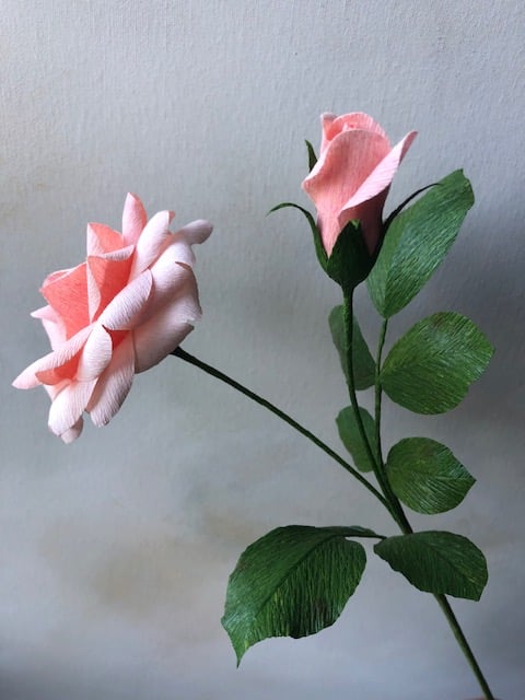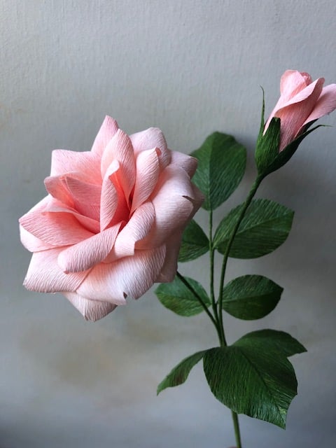A pretty pale peach rose complete with bud and lush foliage, handcrafted from the highest quality, FSC-certified crepe paper. Each part of the flower is painted, cut, shaped and assembled by hand, making every flower unique. A lovely gift for a birthday or anniversary, or perfect for a wedding or for displaying in your home. Can be made in a colour of your choice - please feel free to message me to discuss. Should you require more flowers than the number listed, I would be happy to make additional ones for you. Paper flowers are handmade to order so there may be slight differences to images shown. Stem approx. 31cm in length.