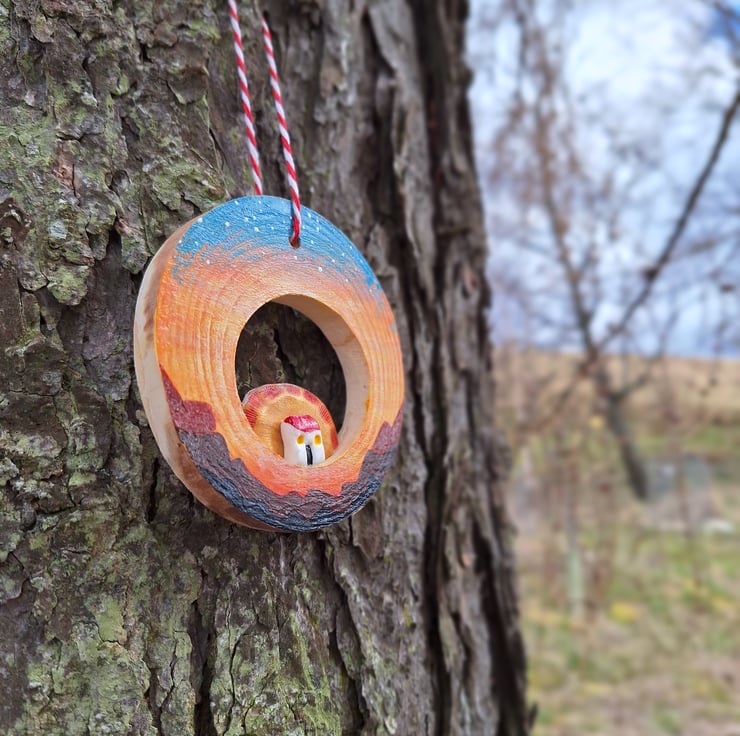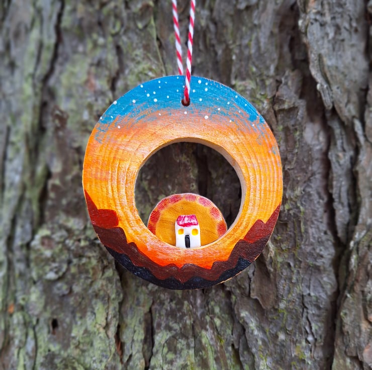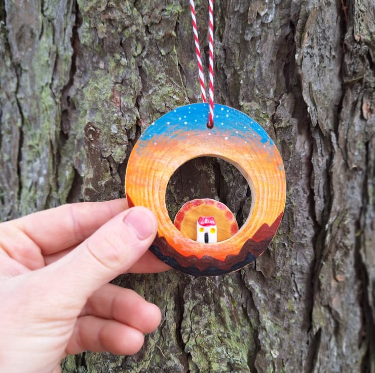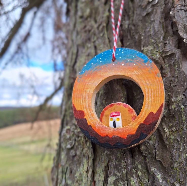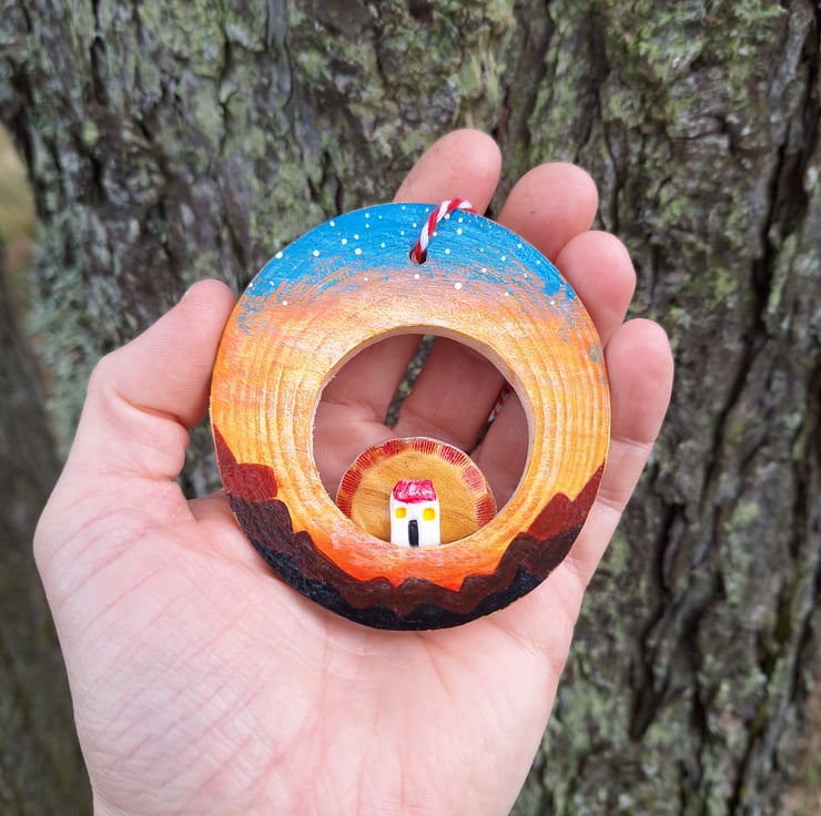 This wood slice has been hand painted, and features a tiny hand sculpted bothy, with agolden sun just slipping behind its roof.