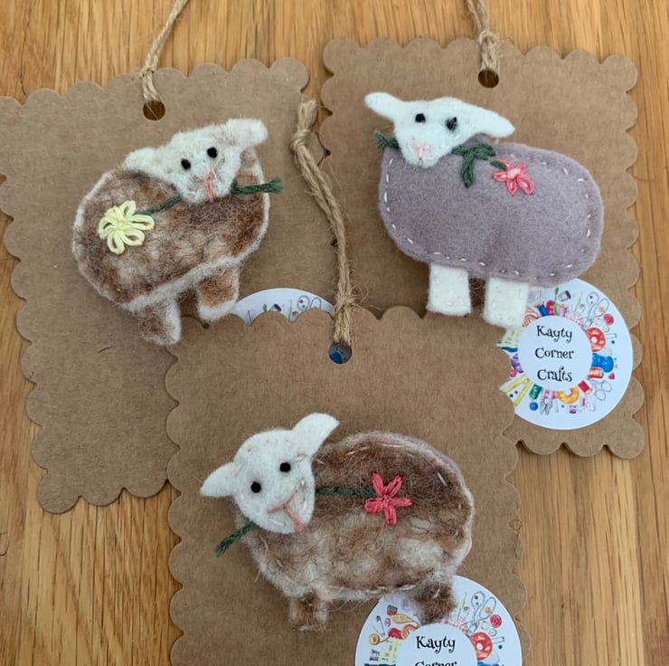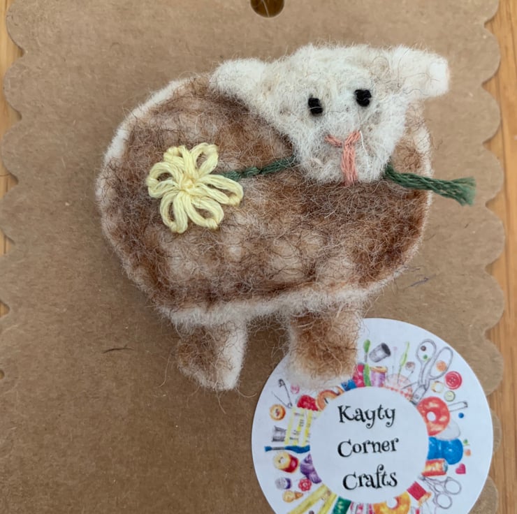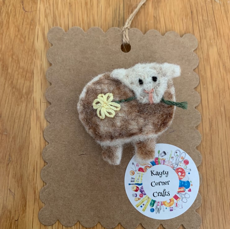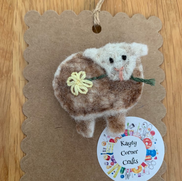 This beautiful sheep brooch has been hand made by felting fibres of natural wool together. She is munching on an embroidered daisy.