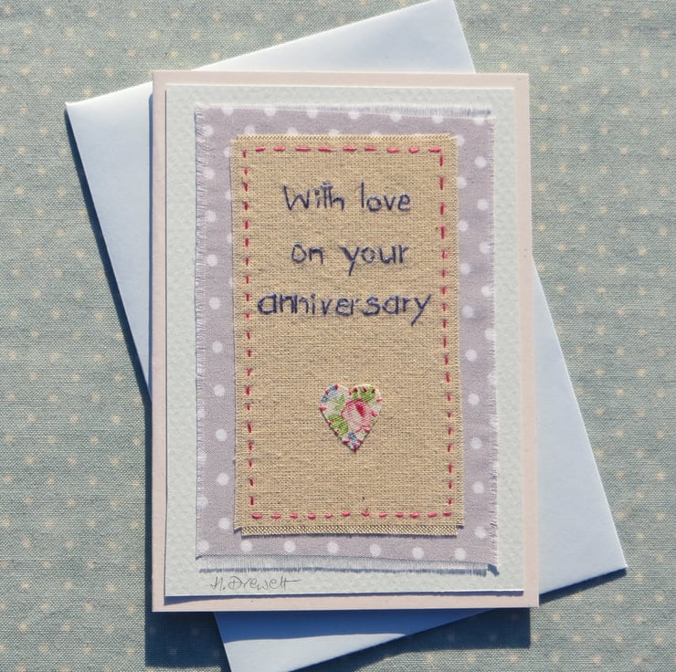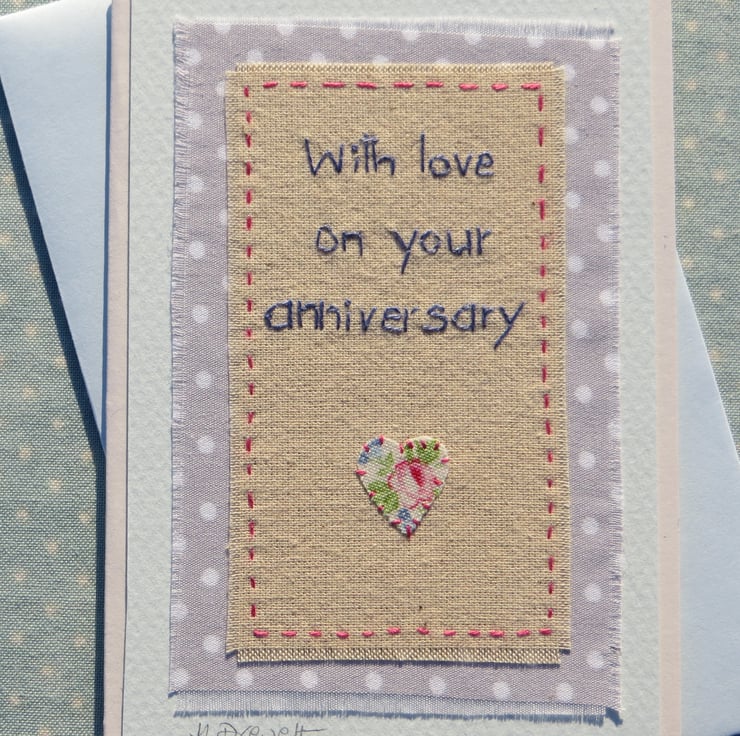 This is a small greeting card featuring a hand-stitched miniature applique heart with hand-stitched the words 'With love on your anniversary'. The central panel is stitched to a pretty polkadot cotton fabric. A pretty little card to keep.