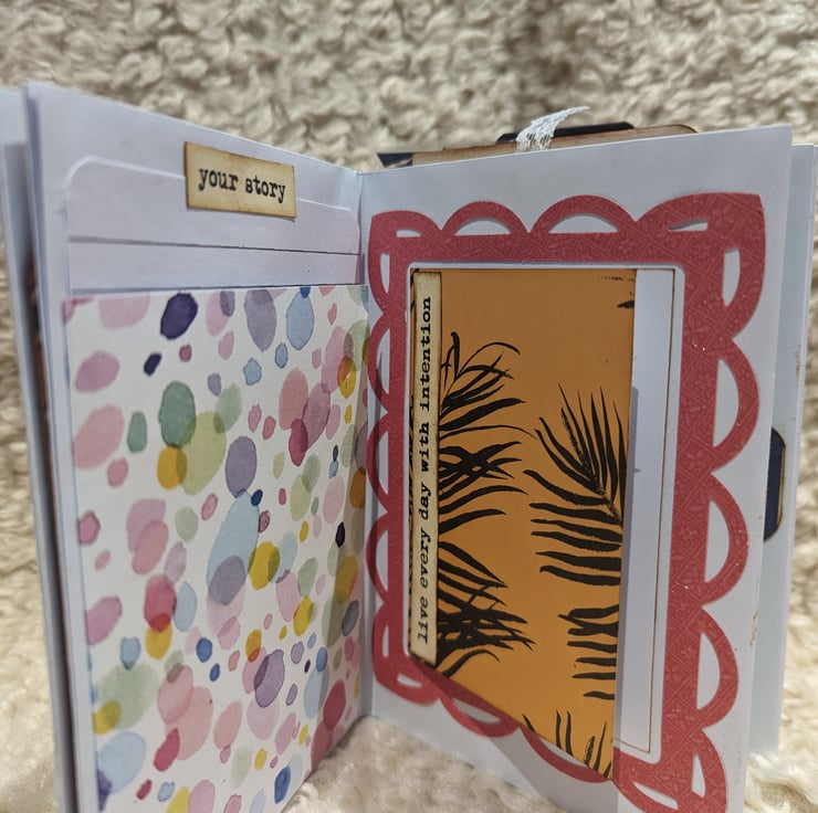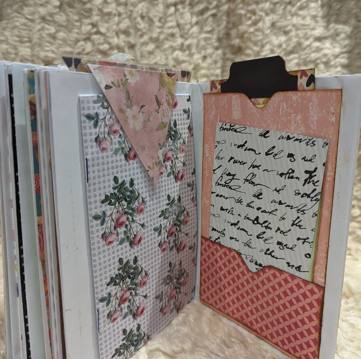Chunky junk journal of many different colours and paper styles. Covered in olive green patterned paper overlaid with a few clashing papers, topped off with dymo ‘Journal’ sticker