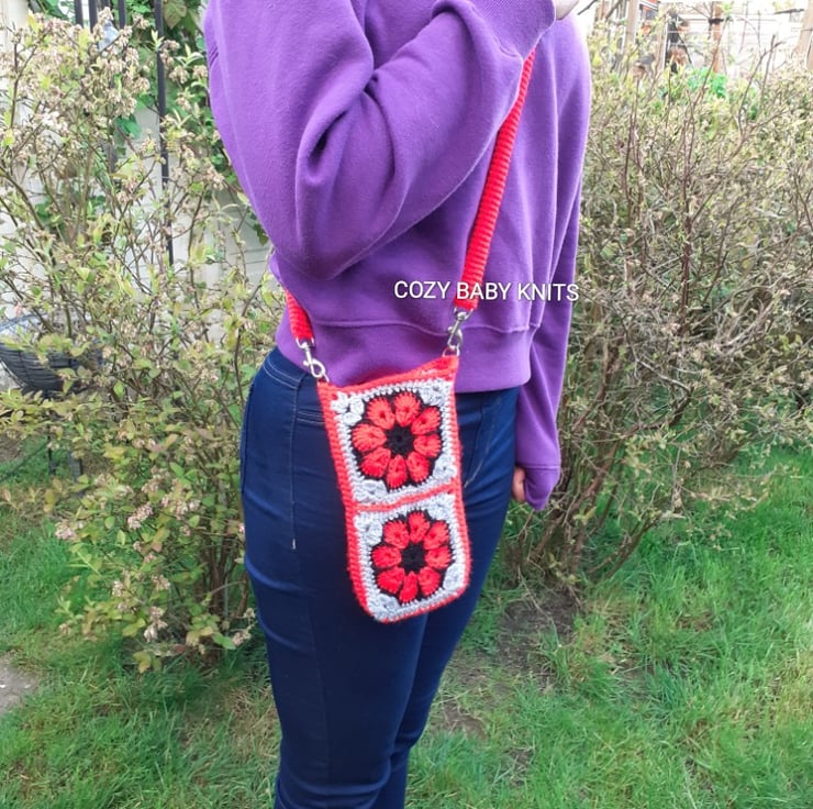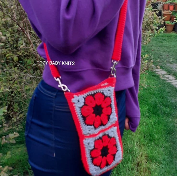 Crossbody phone bag made in granny squares. Red bag with red flowers on each side. Comes with a gusset so can be used for your phone and a small wallet/keys.