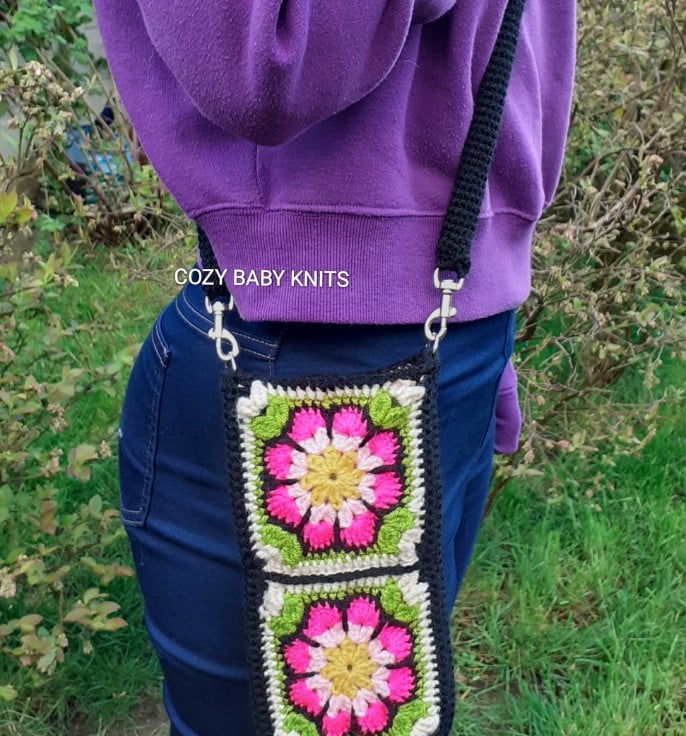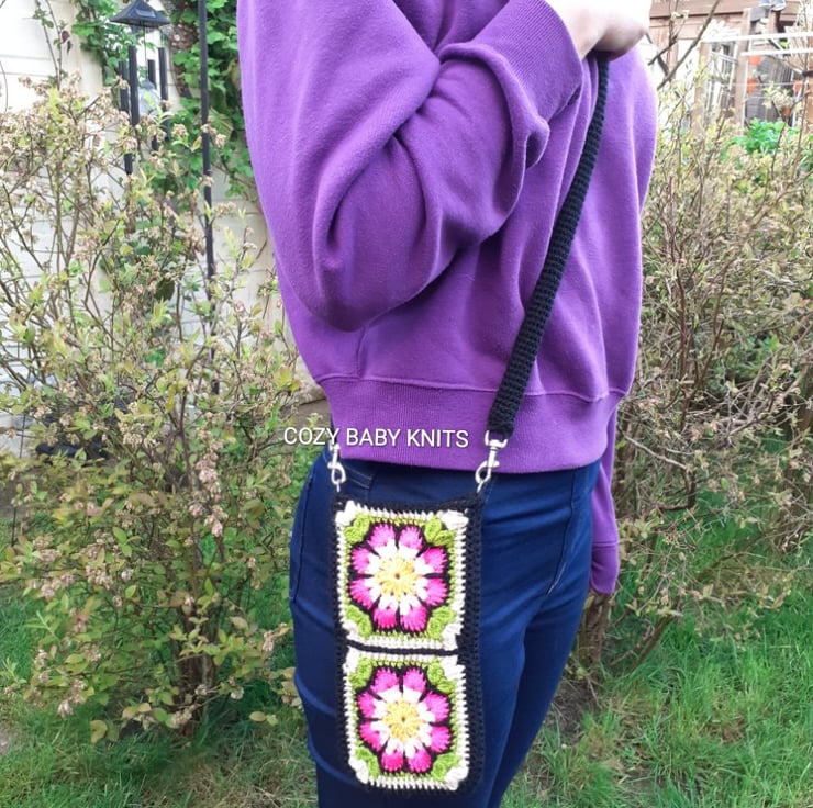Crossbody phone bag made in granny squares. Black bag with pink flowers on each side. Comes with a gusset so can be used for your phone and a small wallet/keys.
