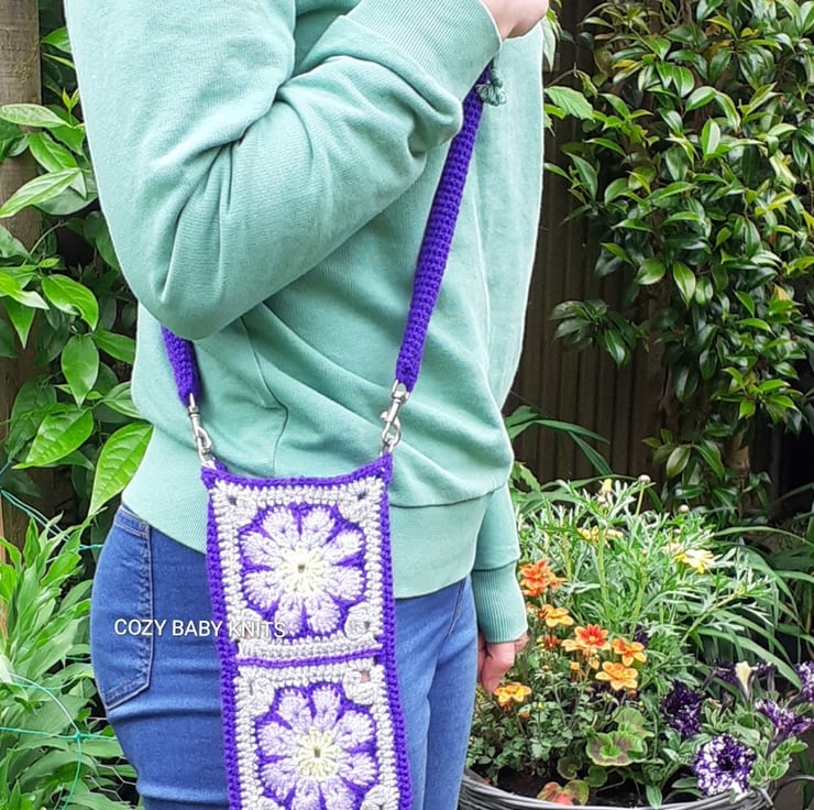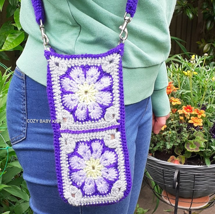 Crossbody phone bag made in granny squares. Lilac flowers on each side with purple strap and gusset. Comes with a gusset so can be used for your phone and a small wallet/keys.