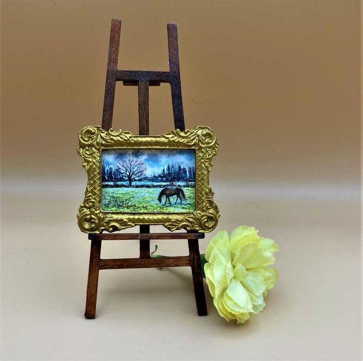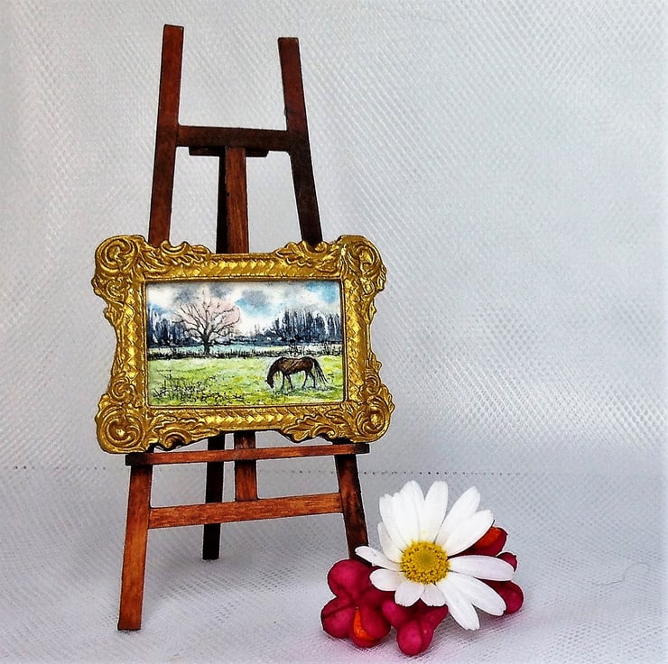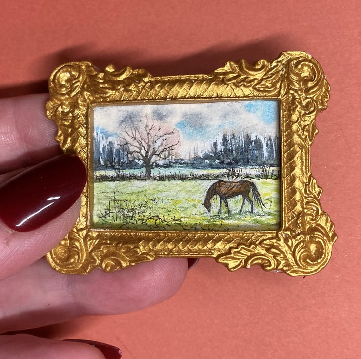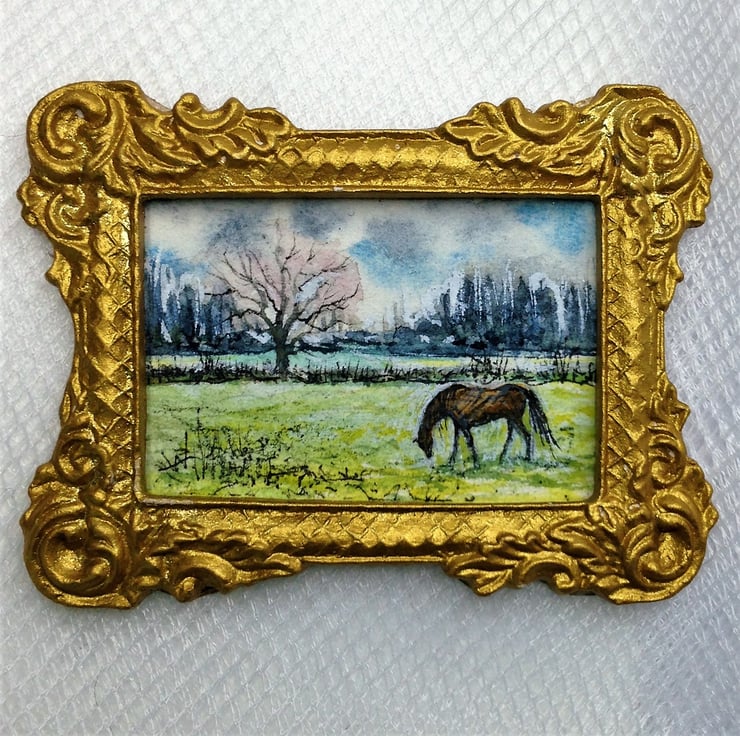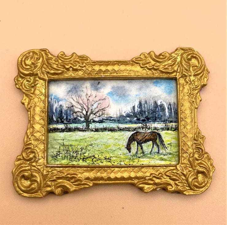 This tiny painting is Dollhouse scale (only the size of a large postage stamp) and shows a landscape with a horse in green fields. The original is hand-painted by me in fine quality watercolour. Spring is here and the pony grazes the lush new grass under the trees.