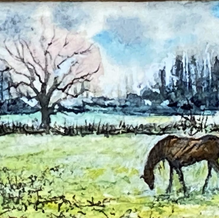 I love to paint horses and landscapes so this little picture is two of my favorite subjects combined. Capturing the changing seasons and the soft colours of spring is always satisfying too.