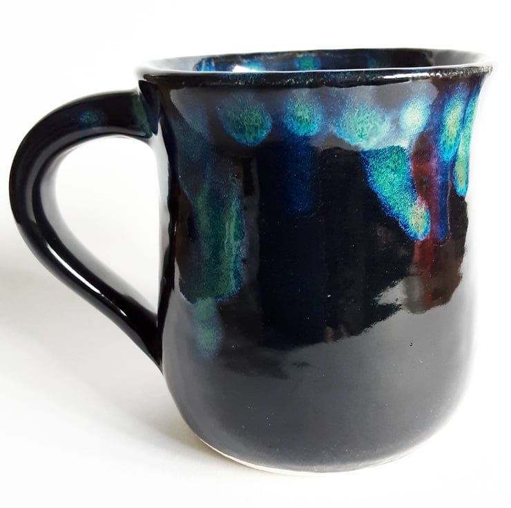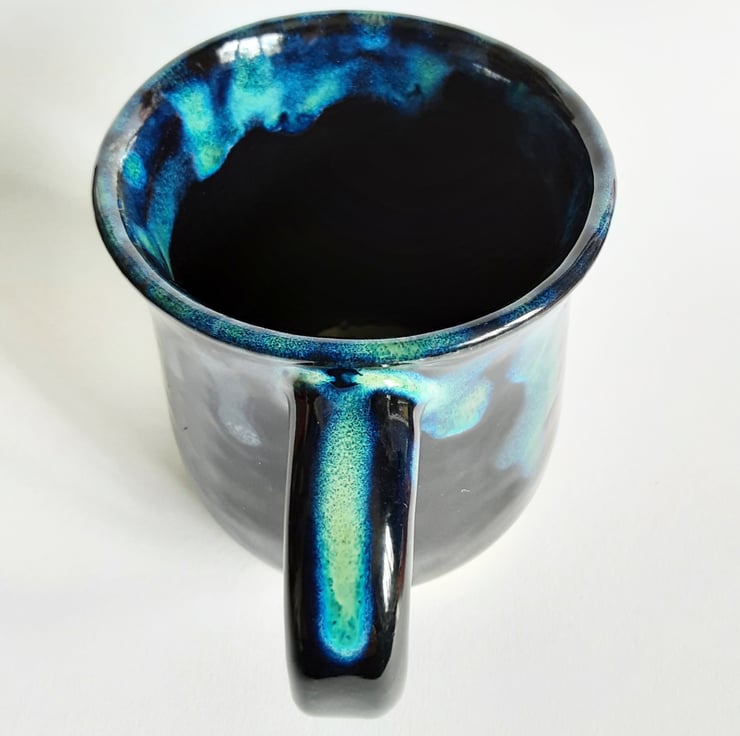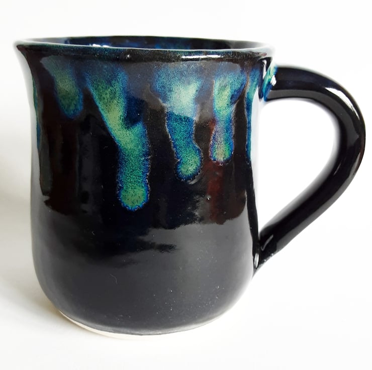 Glazed in blue glazes with a pattern on the mug.
