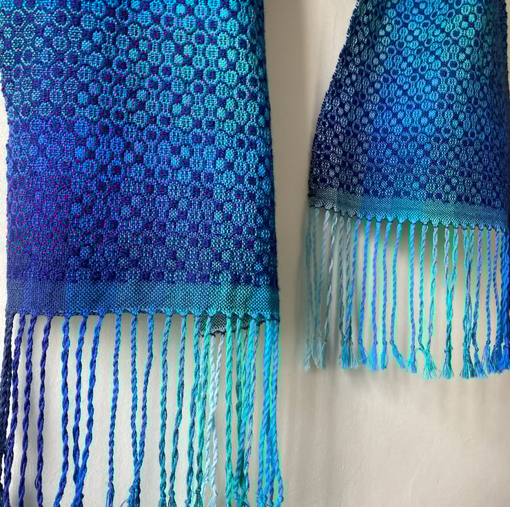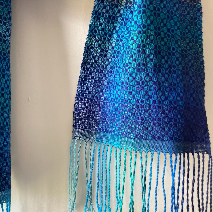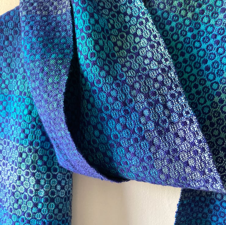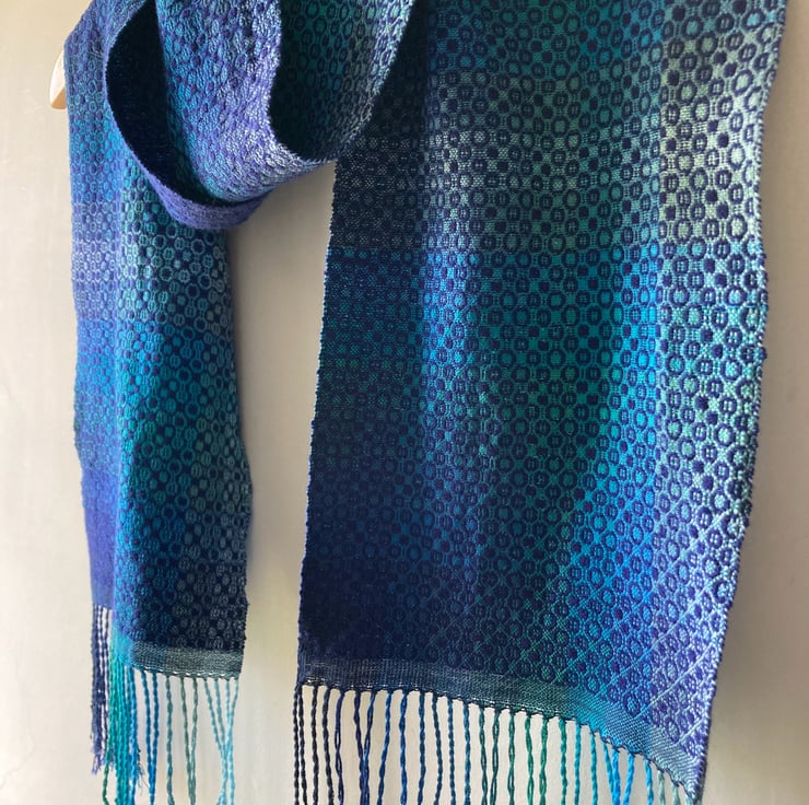 Beautifully soft handwoven scarf in very fine merino and cotton. Handwoven using a Fibonacci graduated warp from navy blue, though teal to turquoise, sea green and ecru. The draft is an old American miniature overshot, forming tiny circles like rain on the sea. The deep blue merino in the weft creates a velvety glow and the gradient in the warp gives a beautiful effect when wound twice around your neck.