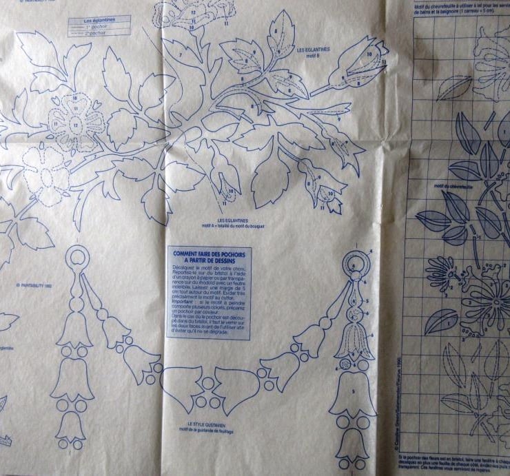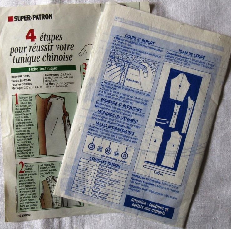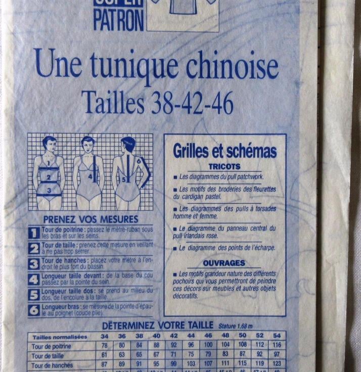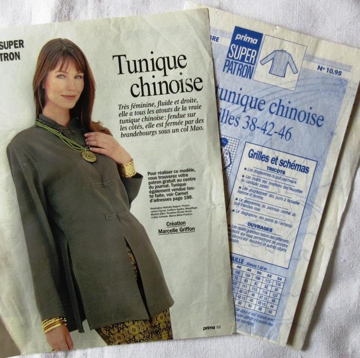 A French multi-size sewing pattern for a woman's long-sleeved Chinese-style tunic. The pattern (which will need to be traced off) is given in 3 sizes: 38 - 42 - 46 (33"/84 cm, 36"/92 cm, 39"/100 cm bust). It was given with Prima, October 1995. The pattern sheet also includes several motifs which could be used for embroidery or painting. They are not iron-on transfers, but could be traced off. The motifs include ribbons, flowers, leaves, garlands, sun, moon and stars. The pattern sheet is in good condition. All instructions are in French.