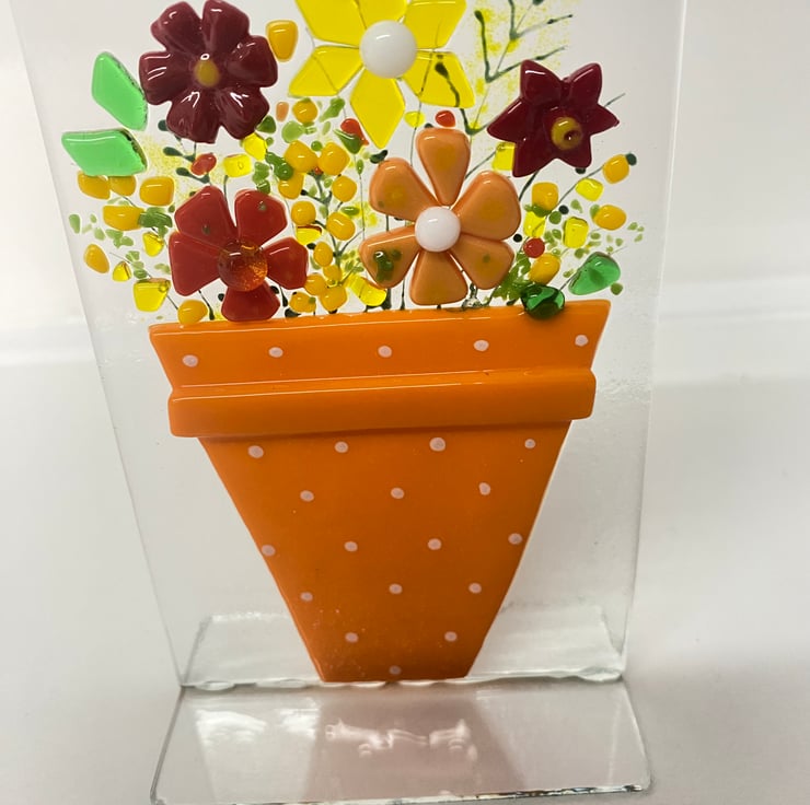 The flower pot stands approximately 5.5 inch high x 4 inches wide and consists of fused glass colours that complement the orange polka dot pot . If you’d like to send as a gift I’m happy to post direct with a short note or you could add in one of my cards .
