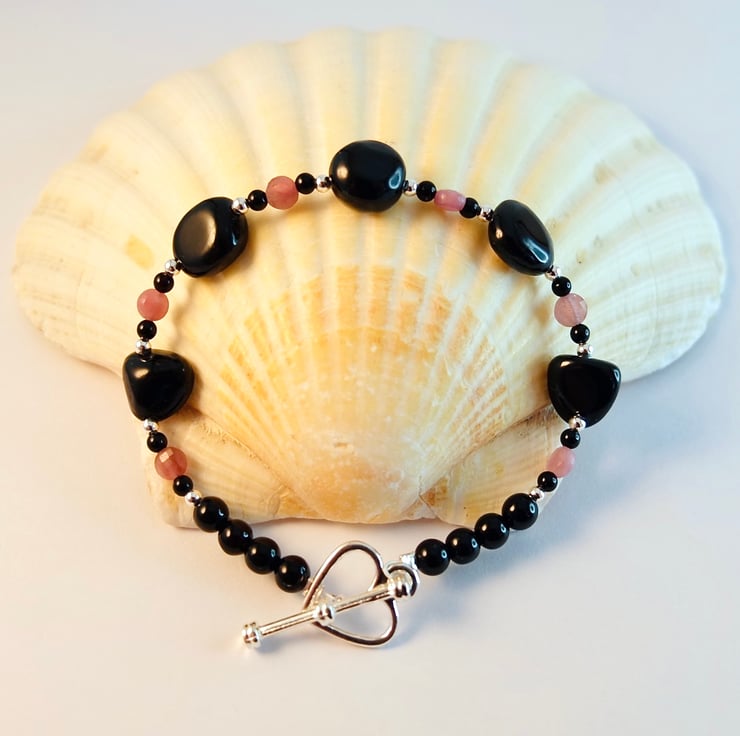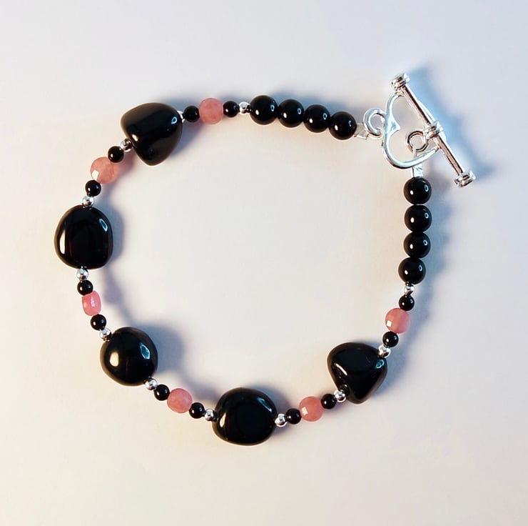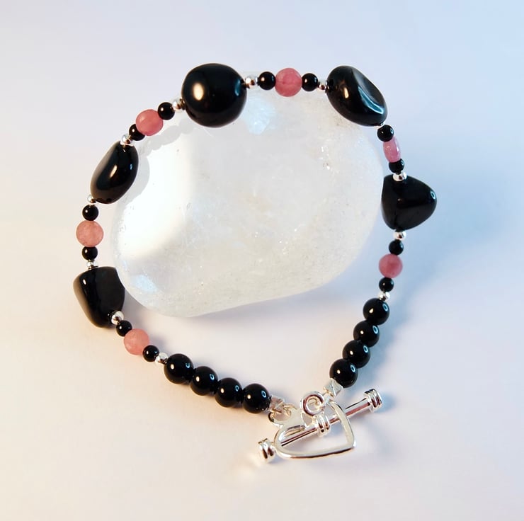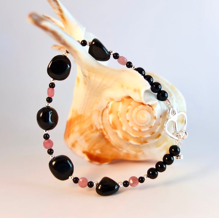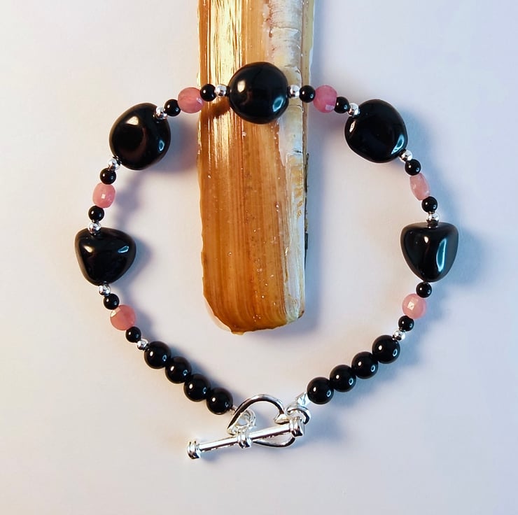 This lovely bracelet features five 9mm nuggets of Black Tourmaline separated by 3mm faceted Pink Tourmaline coins that are bracket by 2mm beads of Sterling Silver and Black Onyx.