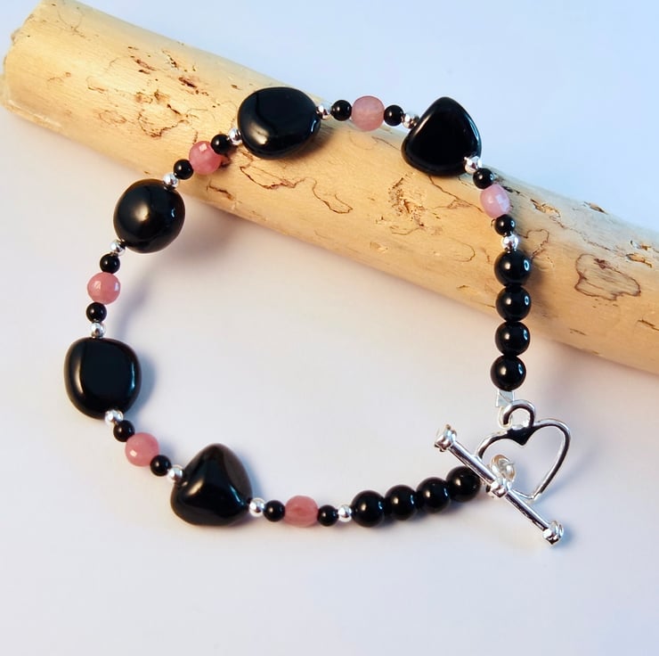 The bracelet ends with four 4mm Black Onyx rounds and a Tibetan silver heart toggle clasp.