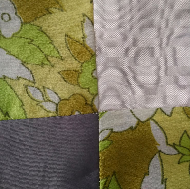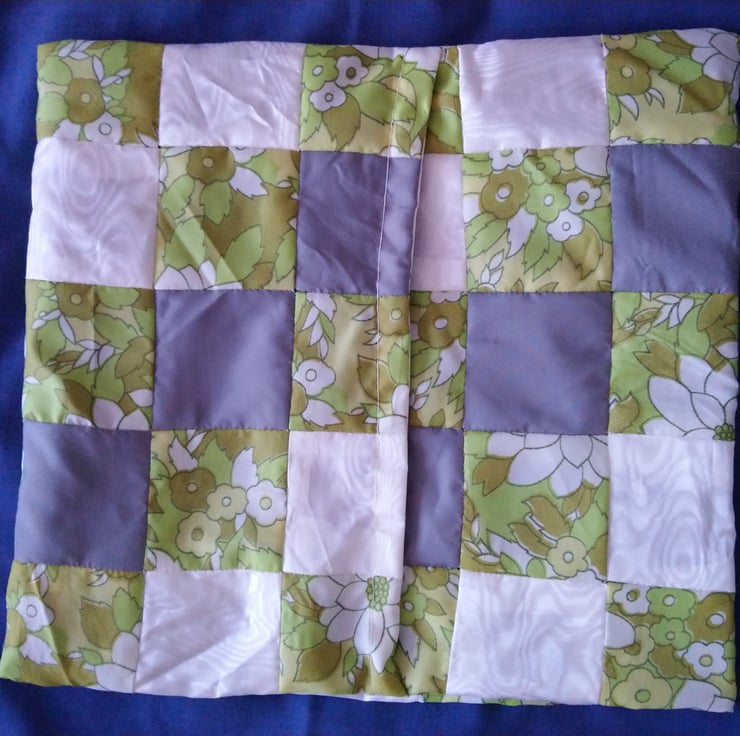 Patchwork cushion cover made with squares of grey, white, and a lime green 1960/70's style floral fabric. The fabrics are all polyester or nylon, so all manmade slightly shiny materials. The reverse of the cover is also in the patchwork, and features a wrapover opening for insertion of cushion pad (not included).