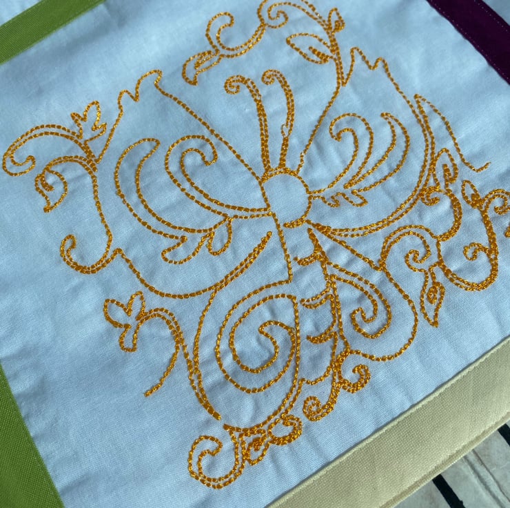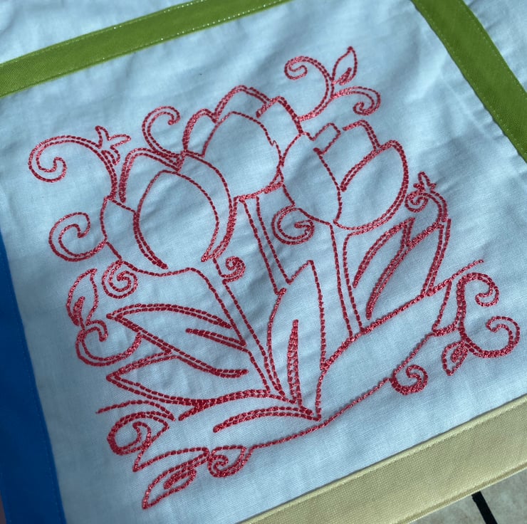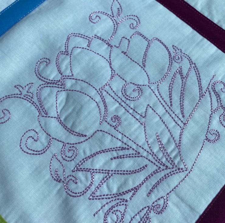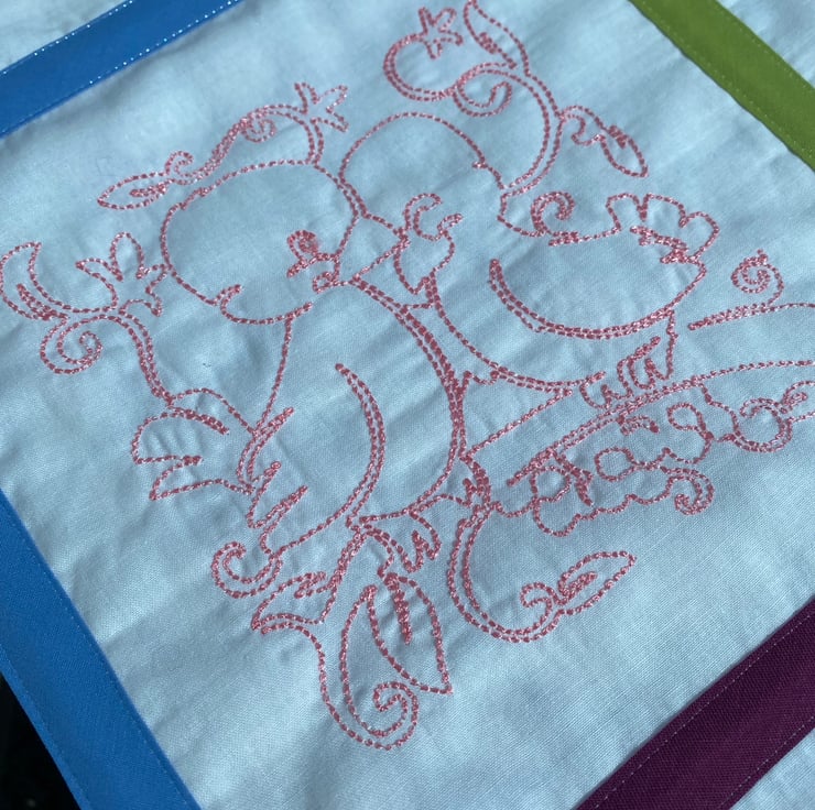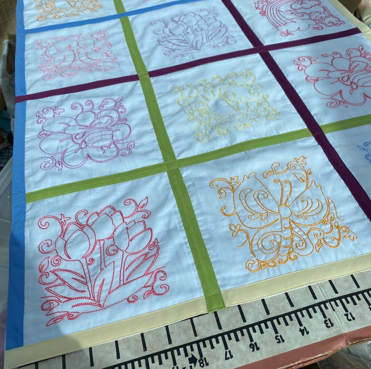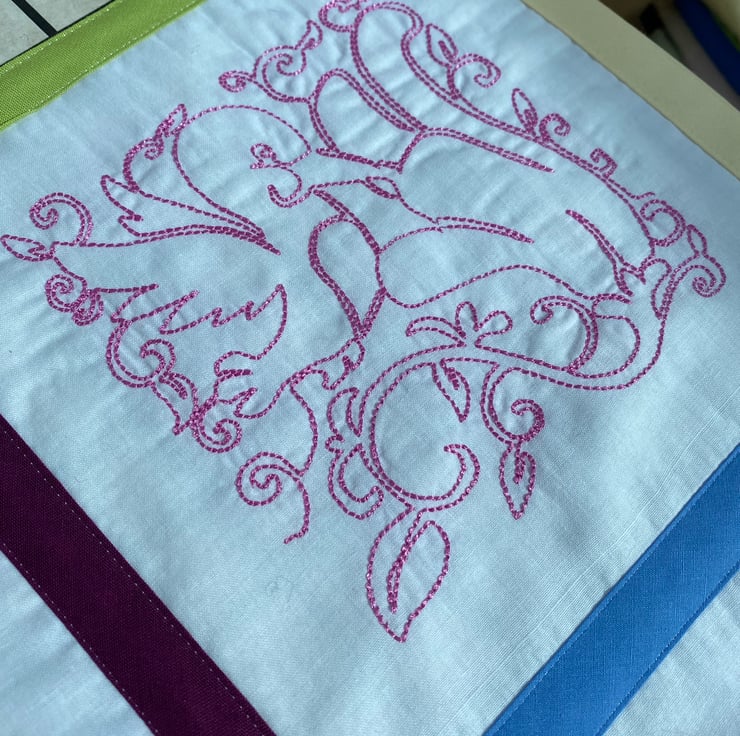 Patchwork table topper with embroideries in different colours on a white background to give a summery feel to your afternoon tea table. The designs show things such as flowers with a bee, a butterfly, lovebirds, mushrooms in single-line stitching. This style is like drawing without taking your pencil off the paper. The blocks are joined with different coloured sashing, it’s backed with white seersucker and can be machine-washed at thirty degrees. The cloth measures 25” x 33” long