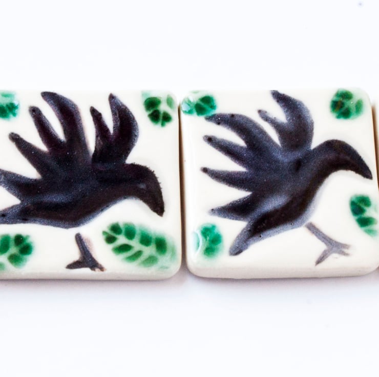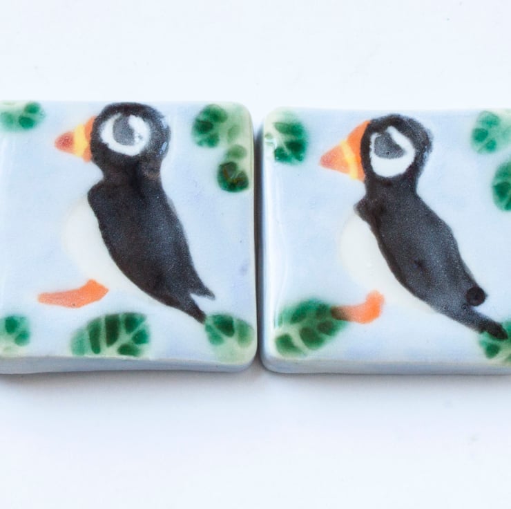 Each piece measures approximately 3.8cm, and has slightly rounded edges. The tiles have been individually hand painted with non toxic glazes. The colours are vibrant, lending themselves well to the whimsical, wide-eyed charm of the design of the creatures.