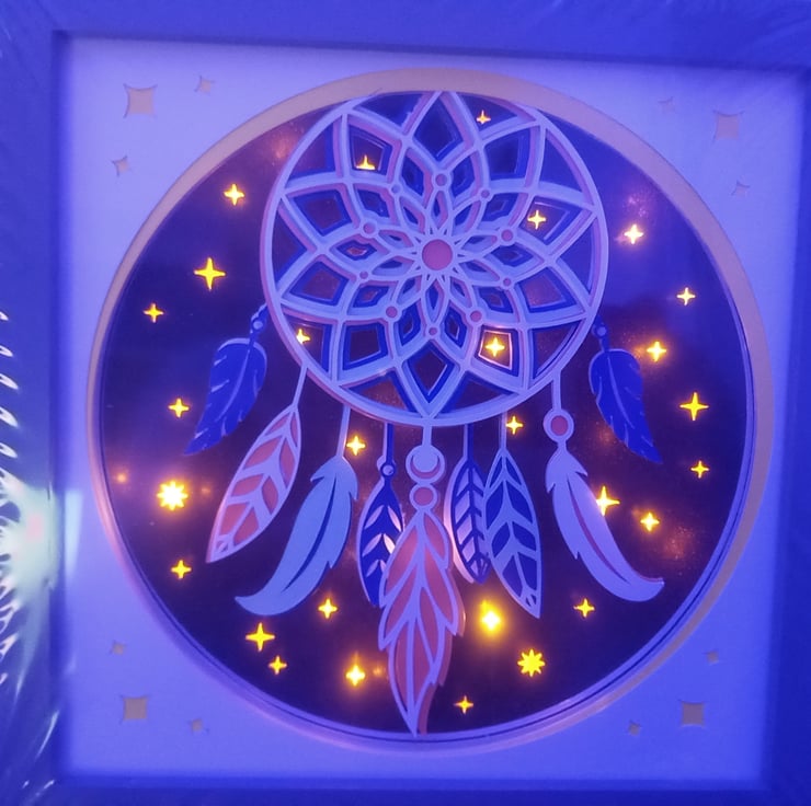 This unusual Night Light depicting a feathered dreamcatcher backlit by fairy lights, would be an ideal gifft at any time of the year. Wether its a present for a Birthday, anniversary, house warming or a Get well soon gift, you can be sure the recipient will be delighted.