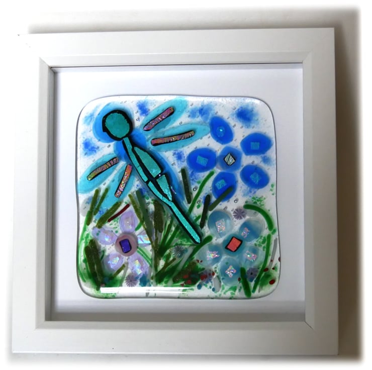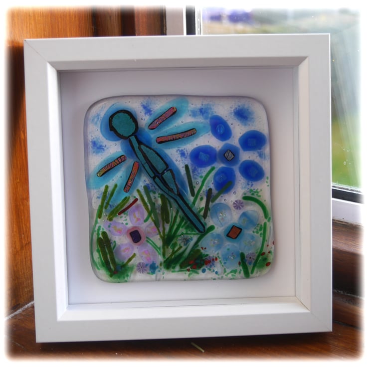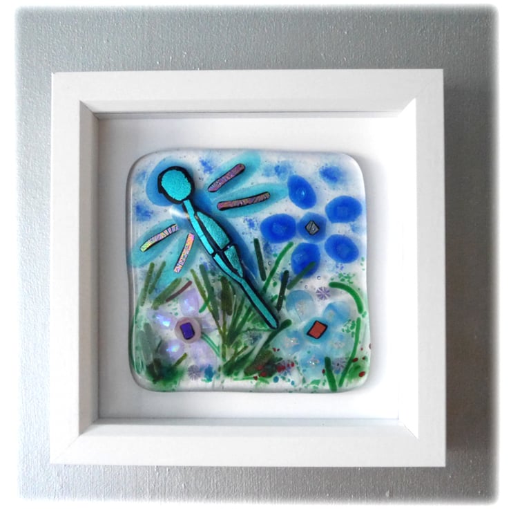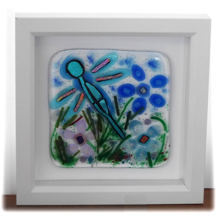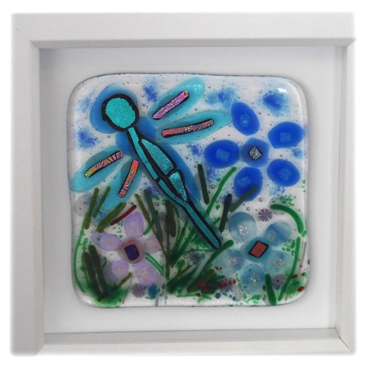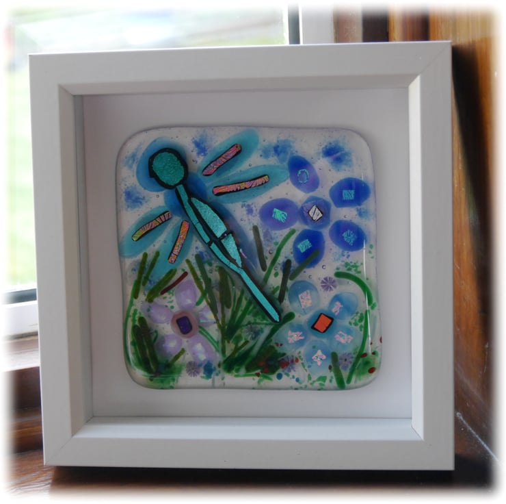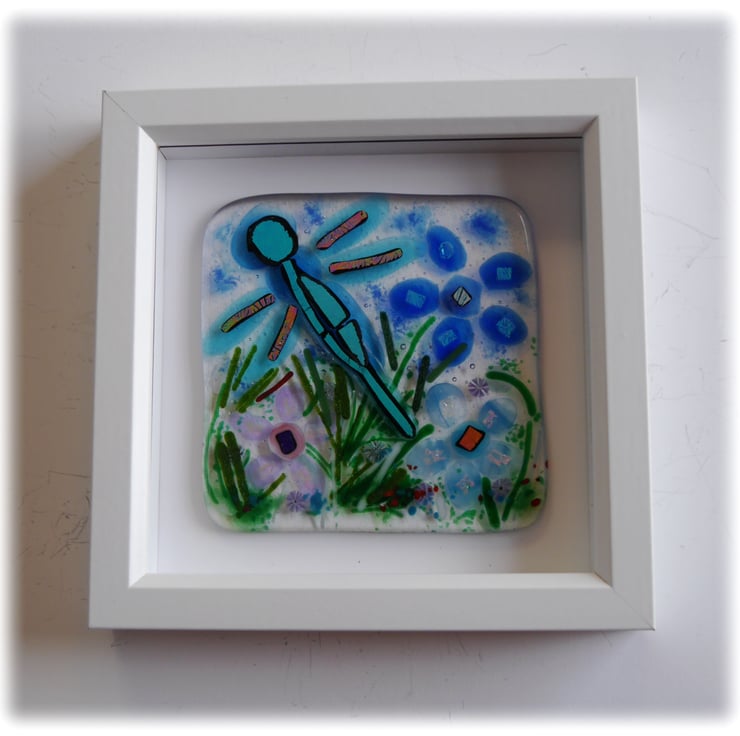The fused flower picture measures 12cm square and is fitted at the back of a box frame with a 13.5 aperture, 18cm square frame, 3.5cm deep.