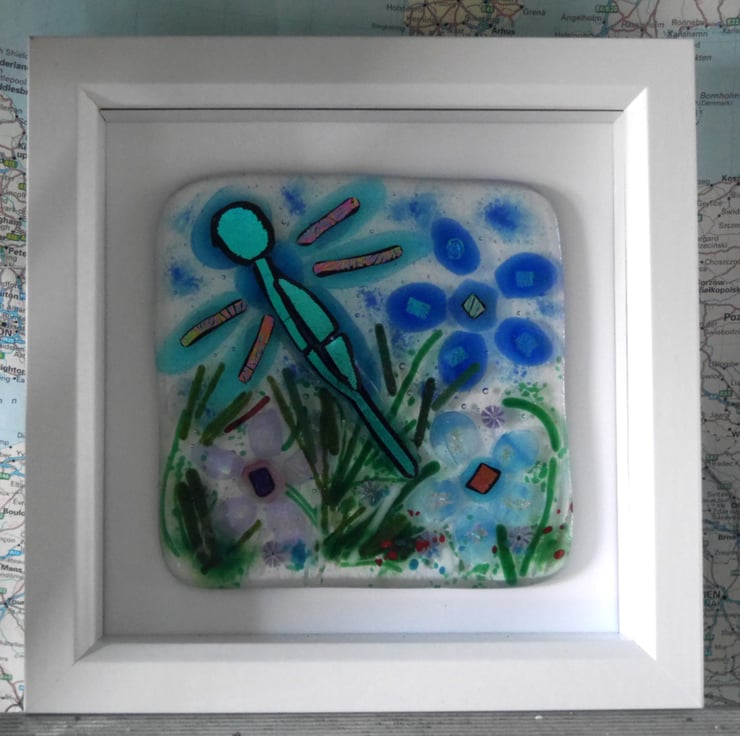 I prepared my glass picture and put it into my kiln and absolutely loved what came out. Then had to decide whether to slump it into a dish, fuse it again to add hangers or frame it. So I framed it and I am really pleased I did.