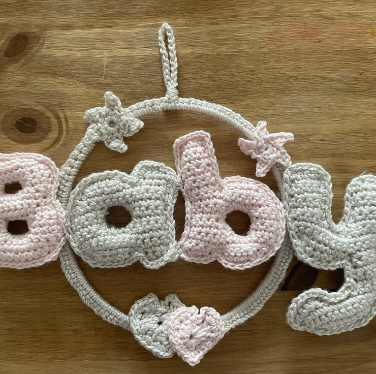 Decorative wall hanging for baby nursery or bedroom . Each letter is crocheted by hand and sewn together and sewn onto the hoop .