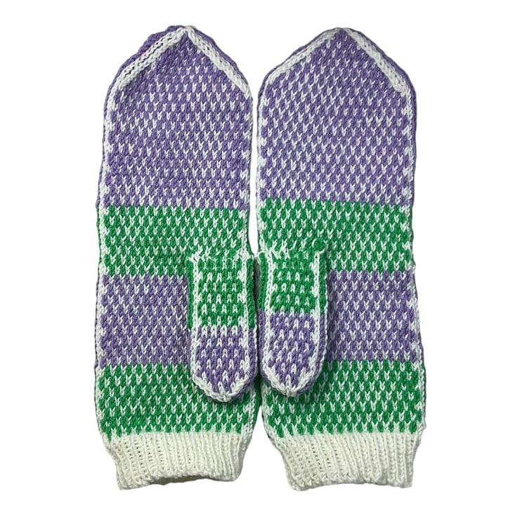 The stranding continues on the palm and the thumbs with an attractive block lines pattern, the thumbs are also patterned with a single violet and foliage.