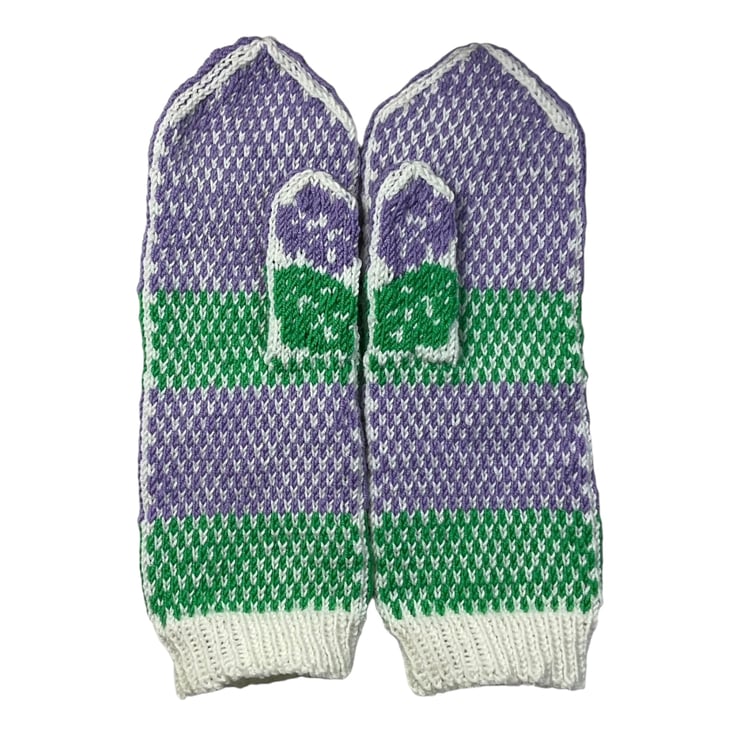These beautiful mittens are in pure soft merino wool so perfect cold weather wear. The pretty floral motif is lilac violets broken up by grass green foliage. The main background shade is white, which is also used for the ribbing.