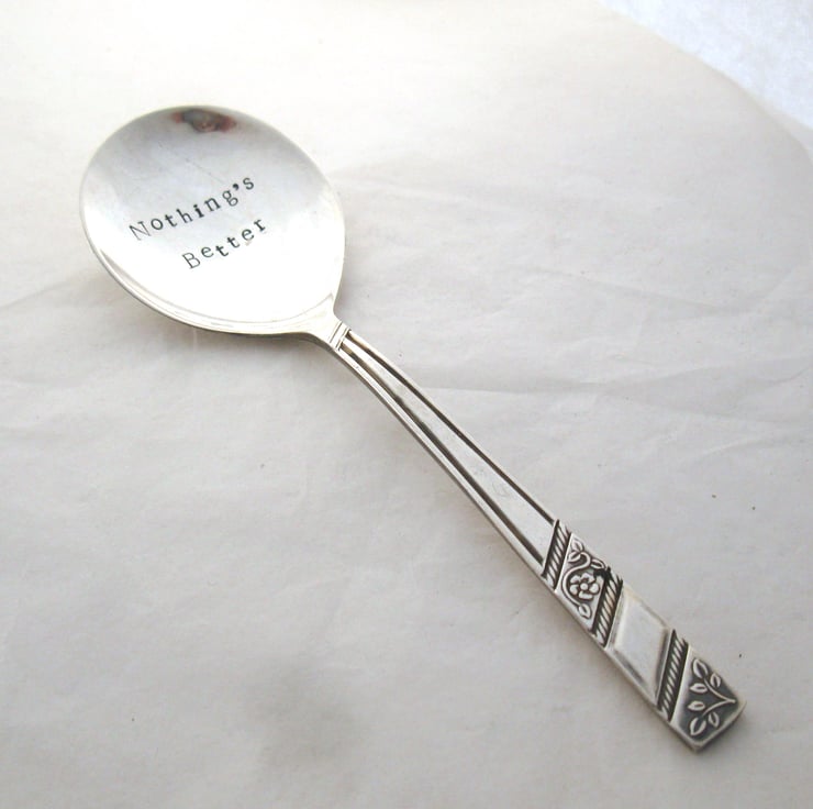 A hand stamped vintage silver plated fruit spoon with the naturism slogan 'Nothing's Better' in black lettering in the bowl. It's a nice round shallow spoon measuring approximately 5 1/2" (14cm) long and it has a pretty floral detail on the handle.