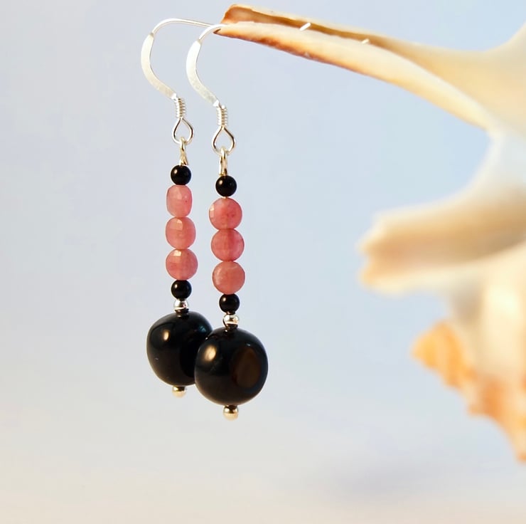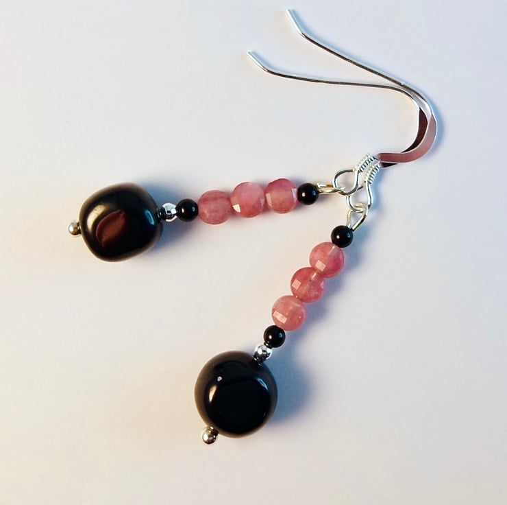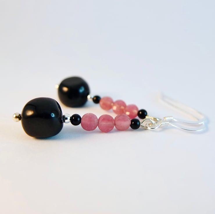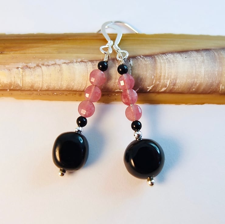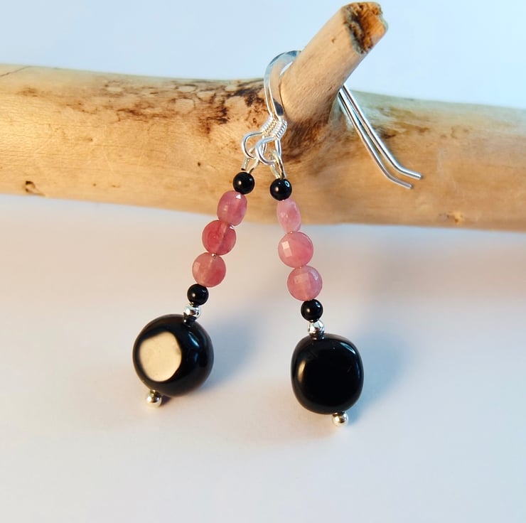 Each earring features a Black Tourmaline nugget of approximately 9x6x4mm topped with a trio of 3mm faceted Pink Tourmaline coins that are highlighted with tiny 2mm beads of black Onyx and sterling silver.