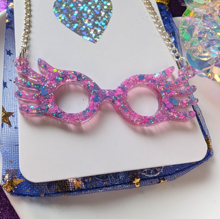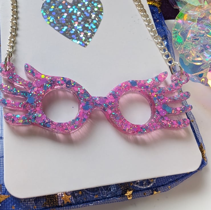 Luna Lovegood glasses inspired necklace. Measures 6.5cm. In pink/blue glitter. Perfect gift for a Harry Potter fan! Silver plated chain approx 22cm. Lighting bolt charm on extender.