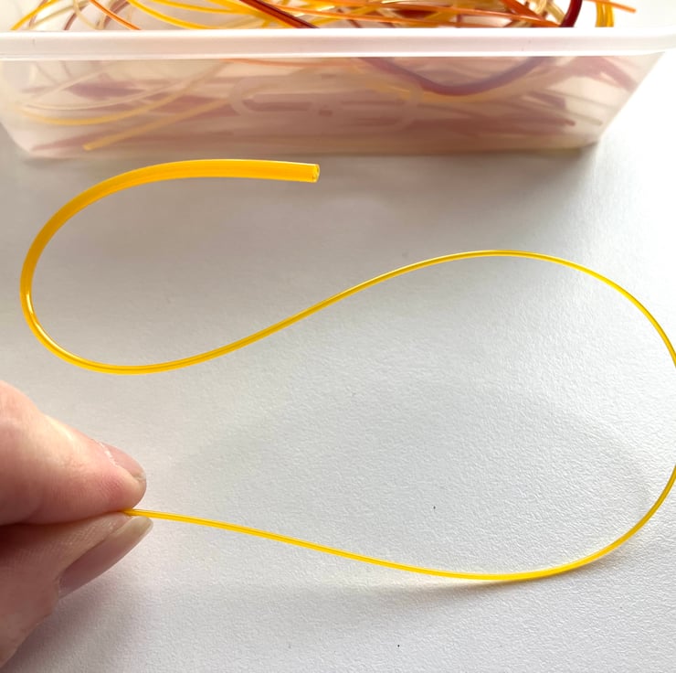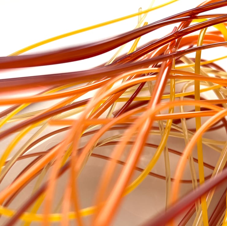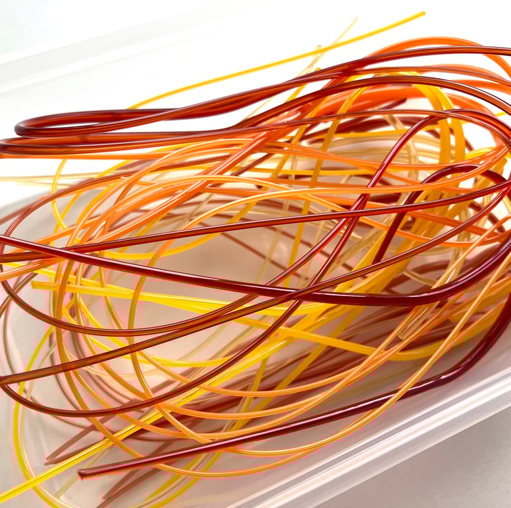 Mixed stringer pack in shades of red, orange, amber and yellow, some streaky. All Bullseye 90coe glass Vitrigraph stringers.