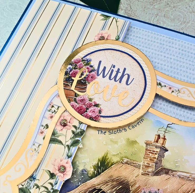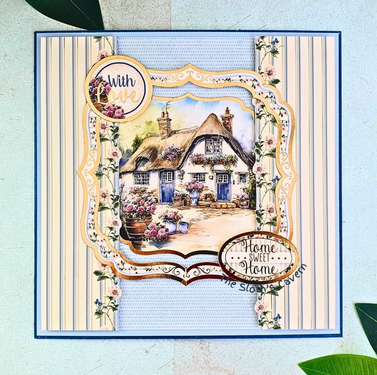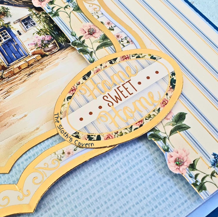 The card consists of a panel of pastel blue cardstock, layered with a light blue patterned card. Two floral panels are on the right & left side of the card, while the gold framed topper stands proudly in the middle. It displays a beautiful cottage house, surrounded by blooming spring flowers! On the top left corner, the button tag reads "With Love" in gold & blue lettering, while the sentiment "Home Sweet Home" is on the bottom right corner. The card has been embellished with glitter colour drops on the flower centres.